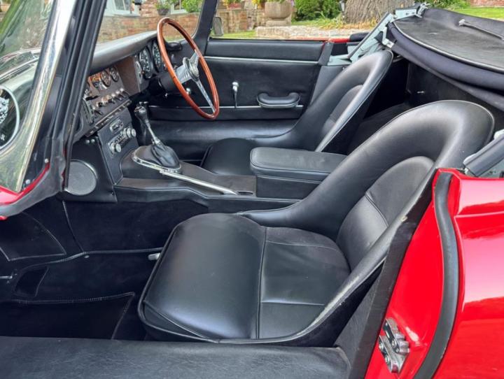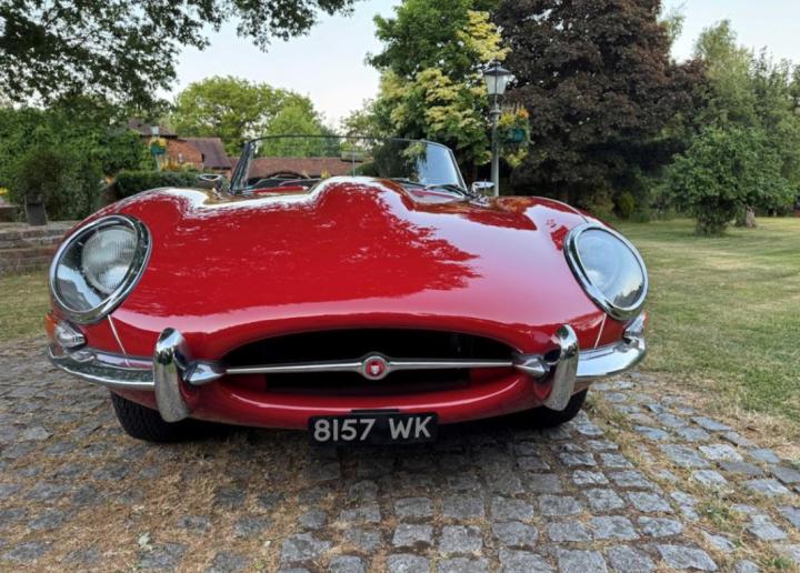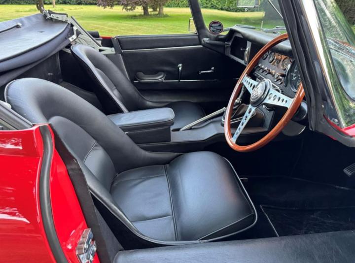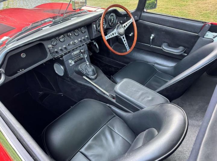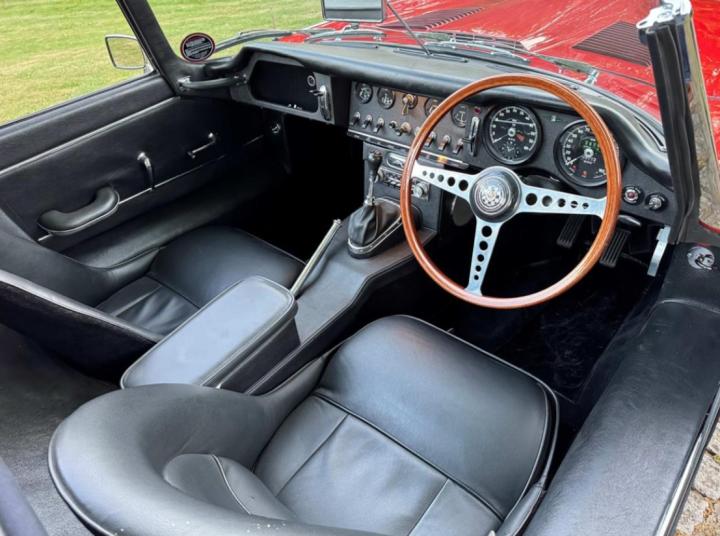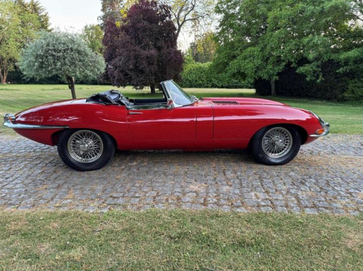 1964 Jaguar E type series one 3.8 Roadster finished in its original Carmen red with a perfect black hide interior and a black mohair hood and sitting on perfect 5" chrome wire wheels. It is supplied with a Jaguar Heritage certificate which confirms that retains its original Engine, Gearbox, and Body all of which can be checked on inspection of the car. Restored about 15 years ago but has had very little use since and has therefore remained in exceptional condition. Always destined to become a collectors item and described by Enzo Ferrari as the most beautiful motor car ever produced. The twin overhead camshaft engine is 3800cc with a power output of 265bhp with 240lbs of torque and a published 0-60 time of just 6.4 seconds which were outstanding figures in 1961 and certainly more than adequate today. This 1964 Jaguar E type 3.8 series one roadster is undoubtedly one of the very best early E types currently on the market today. Still with its original Coventry registration number of 8517 WK as it was first registered by Jaguar cars on behalf of a client who resided oversseas. With only 3600 miles since the restoration, the car performs extremely well and is ready for immediate use. The conversion to right hand drive was executed by Twyford Moors who have many years of experience with classic Jaguars and the conversion has been expertly carried out. The most recent service was done by another well respected Jaguar restorer which has included balancing the tripple SU carburettors and fully checking the car ready for the next discerning owner. Compare this car with others on the market and you will see that it is not expensive at £99,500