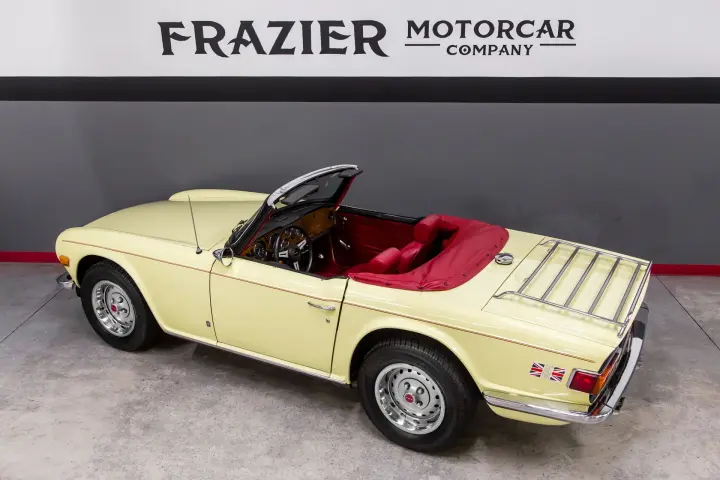 This absolutely exquisite color combination on a frame off restored OVERDRIVE TR6 is the real TR6 experience !! I received this car on a warm sunny day recently and had to embark on a top off British Roadster experience. This TR6 is everything one remembers and enjoys in a tight, well serviced TR6.The car has great audio sound with the upgraded exhaust .The exhaust married to a tight suspension ,quiet, correct operating overdrive transmission and an engine that absolutely purrs then visually a CRISP sharp interior with a beautiful wood dash ,fresh sills and windlace, crisp correct operating gauges as well as full well padded seats- The whole experience is pleasing and definitely brings a smile to your face.