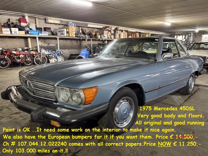 Mercedes-Benz 450SL. With the 4.5L V8 engine and automatic transmission. A classic sports car with tons of potential! This 450SL has 103,165 miles on the odometer and is in very good, original condition. The body and floors are in good condition, as is the paint. We also have European bumpers available. The interior needs attention; the seats need to be reupholstered. A very interesting 450SL, for a very interesting price. Big choice in REAL Classic Cars in the Stolze Collection ! From a project to perfect.