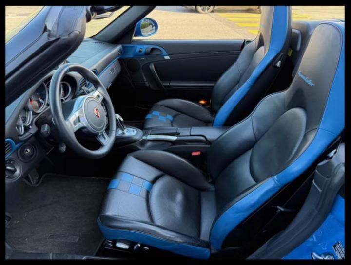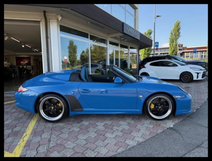 Rare et estivale Porsche 997 Speedster PDK dans une flashy livrée Bleu Profond sur cuir Noir, modèle produit à seulement 356 exemplaires, état magnifique, très soignée, suivi Porsche complet, inspirée de la Porsche 356, elle se distingue par son pare-brise plus court, ses arches de roues élargies, son intérieur luxueux en cuir, équipée du Flat 6 3.8 litres de 408 chevaux, navigation Pack Europe, réception radio SAT, Pack Option 911 Speedster.