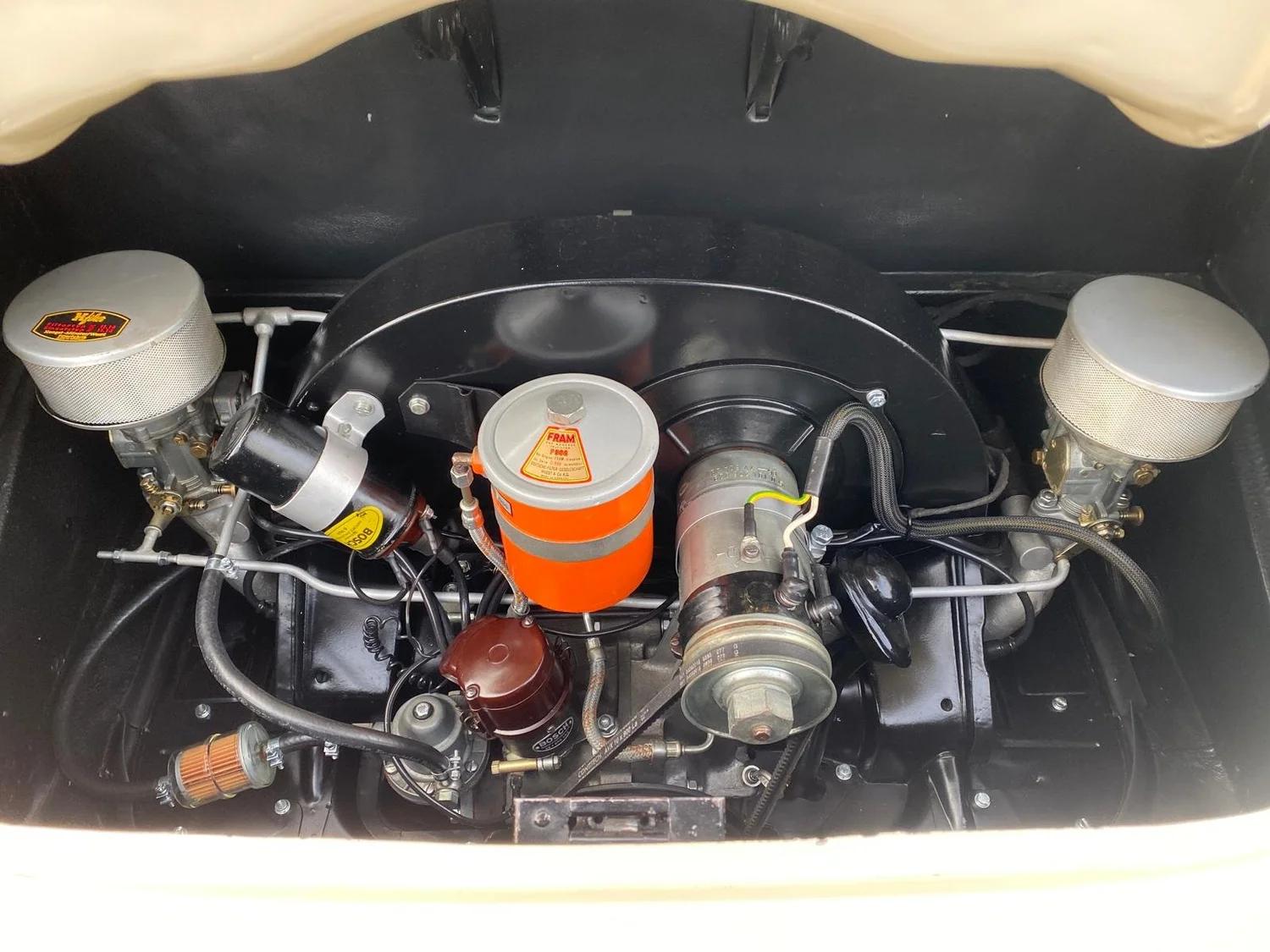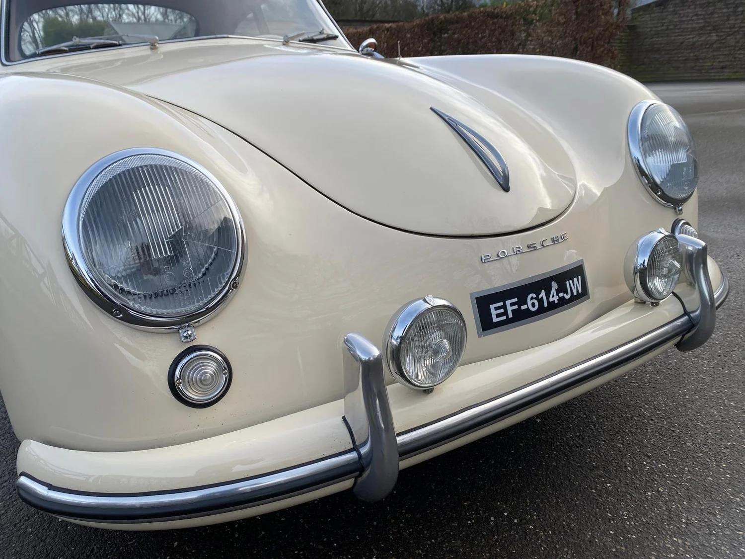 Beautiful Porsche 356 Pre A Knickscheibe coupé from 1954. This car has been ordered by the famous Porsche dealer Hoffman in New York. It was ordered as a standard coupé in black with a green leather interior with as only options: a sleeper seat and a pair of Bosch driving lights. The customer who it was ordered for was a Mr Plummer. Maybe Christopher plummer? The famous actor and Porsche enthousiast? At some point in the past the car has returned to Europe where it has been totaly restored and received this very elegant beige colour with a brown leather interior combination. The full body was restored before being painted and is still in outstanding condition. Mecanically the car has received a period correct 1500cc flat four engine, but not matching any more. Any records on why this car swapped engine is unfortunately unknown. The engine is completely rebuild aswell as the gearbox and runs as new. All other mecanical components also received a rejuvenation cure. Also all was kept as original as possible. Still in 6V configuration! The brown leather interior is in really good condition as is all the rest of the interior. The dashboard has its VDO gauges who are all rebuild and working well. You will notice the Telefunken radio is still in it's place. The front luggage compartment houses a chrome spare wheel and a new Optima 6V battery who is connected to a battery kill-switch underneath the dashboard. On the outside of the car you will find 2 Marchal driving lights, a Nurburgring badge and Reutter logo. A engine hood luggage rack comes with the car but is not fitted at this time. All the new chroom wheels have been wrapped with new period looking tyres in size 5.00-16. If you are looking for the ancestor of all Porsche's, than this is the real deal.