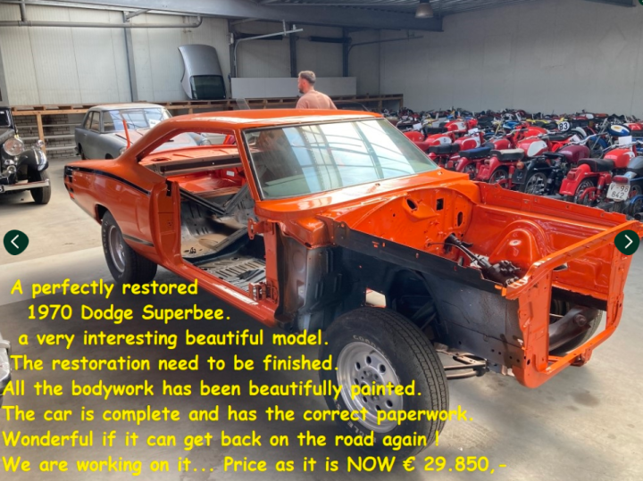 A perfectly restored 1970 Dodge Superbee. VERY beautiful, interesting model. The restoration still needs to be finished. All the bodywork has been beautifully painted. The car is complete and has the correct paperwork. Wonderful if it can get back on the road again ! We can also finish it for you .