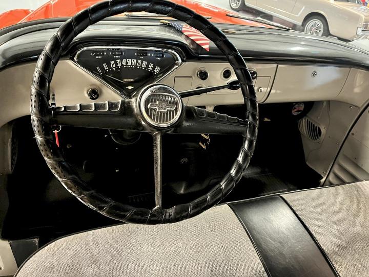 These new series also have the typical "wrap-around" windshield and a wider hood emblem. Two-piece fender emblems are mounted above horizontal fender line. This 1956 2-seater was the last one to have an eggcrate grille. It has a nice gray interior and comes with a manual transmission.