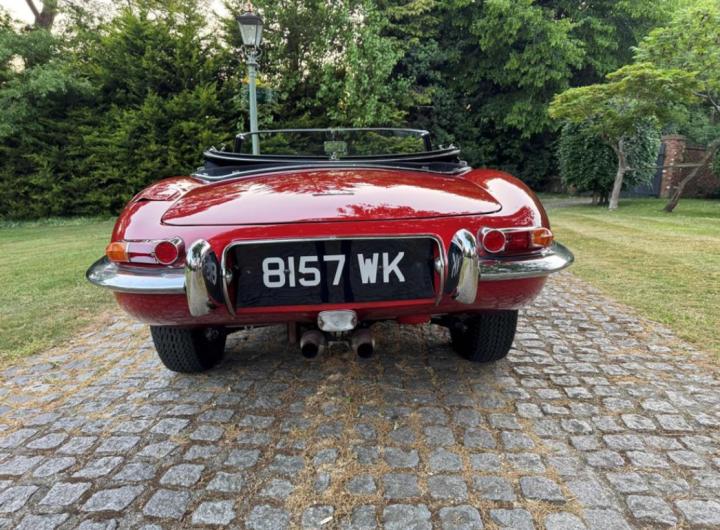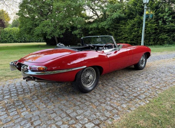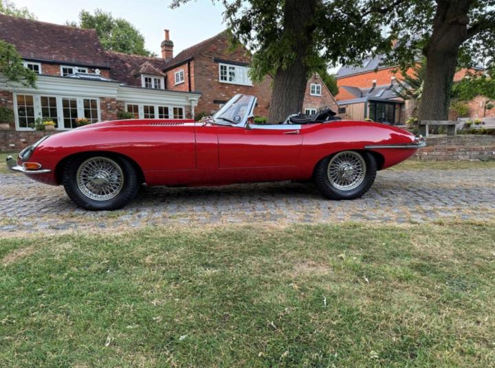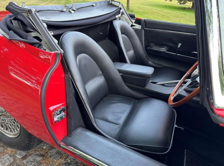 1964 Jaguar E type series one 3.8 Roadster finished in its original Carmen red with a perfect black hide interior and a black mohair hood and sitting on perfect 5" chrome wire wheels. It is supplied with a Jaguar Heritage certificate which confirms that retains its original Engine, Gearbox, and Body all of which can be checked on inspection of the car. Restored about 15 years ago but has had very little use since and has therefore remained in exceptional condition. Always destined to become a collectors item and described by Enzo Ferrari as the most beautiful motor car ever produced. The twin overhead camshaft engine is 3800cc with a power output of 265bhp with 240lbs of torque and a published 0-60 time of just 6.4 seconds which were outstanding figures in 1961 and certainly more than adequate today. This 1964 Jaguar E type 3.8 series one roadster is undoubtedly one of the very best early E types currently on the market today. Still with its original Coventry registration number of 8517 WK as it was first registered by Jaguar cars on behalf of a client who resided oversseas. With only 3600 miles since the restoration, the car performs extremely well and is ready for immediate use. The conversion to right hand drive was executed by Twyford Moors who have many years of experience with classic Jaguars and the conversion has been expertly carried out. The most recent service was done by another well respected Jaguar restorer which has included balancing the tripple SU carburettors and fully checking the car ready for the next discerning owner. Compare this car with others on the market and you will see that it is not expensive at £99,500