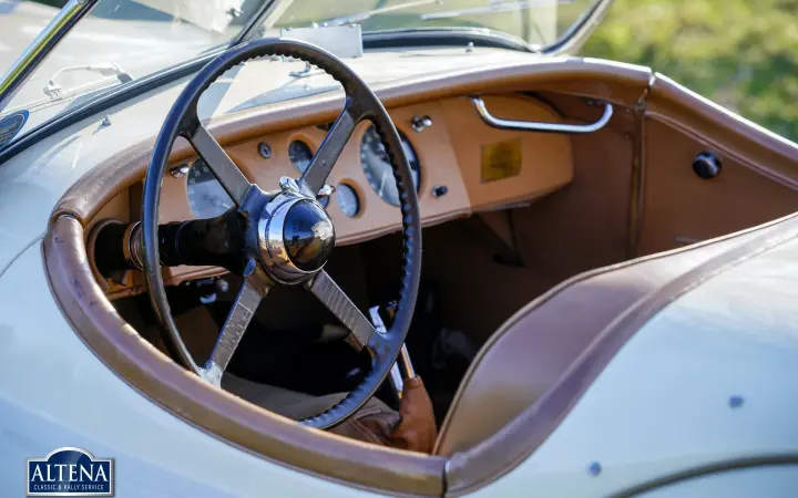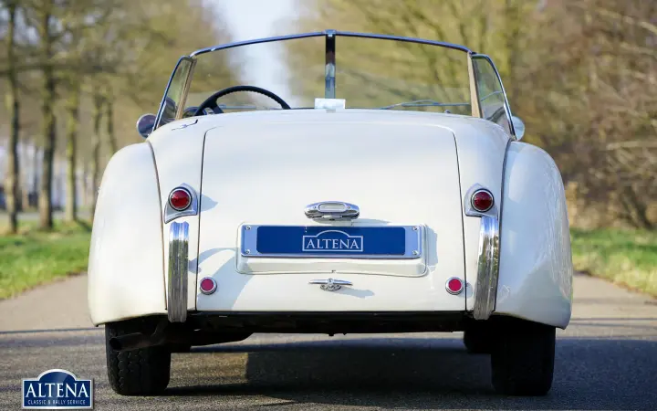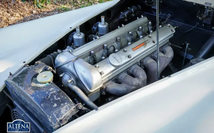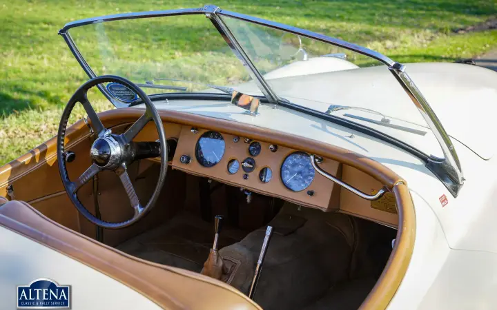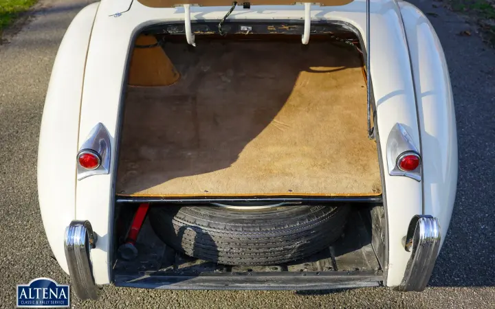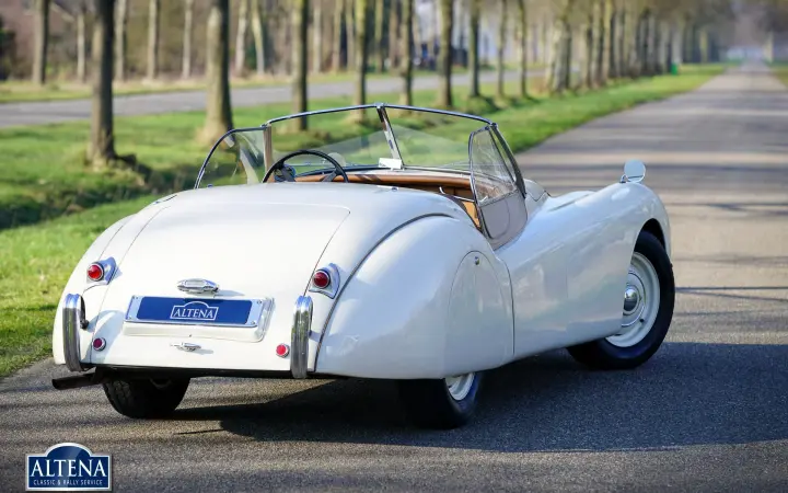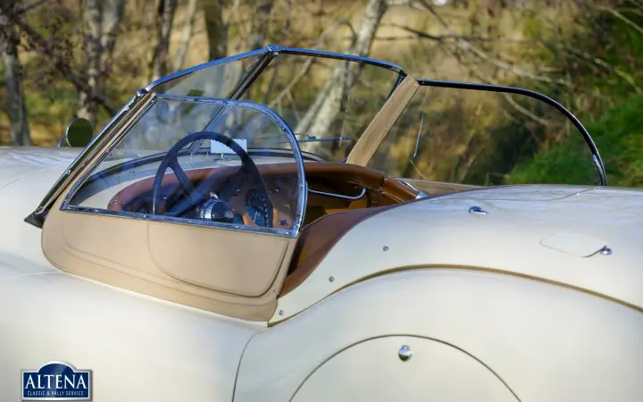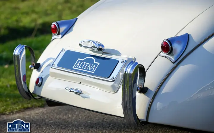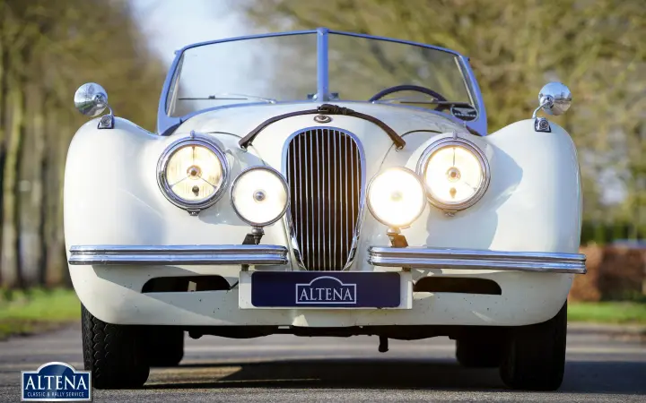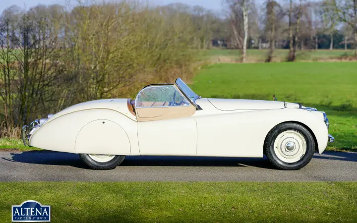 Jaguar XK 120 Alloy MILLE MIGLIA Roadster, year 1949. Chassis number 670062, engine number W1161-7, gearbox number JH1350. A Heritage Certificate is available confirming that the chassis and engine are factory original ('matching numbers'). The cylinder head has been replaced in the past. The cream-colored exterior and dark beige leather interior are almost identical to the color scheme in which the car left the factory in 1949. The Jaguar XK 120 Alloy is a historically significant collector's car that marks the introduction of the legendary Jaguar XK six-cylinder engine with twin overhead camshafts. The Jaguar XK 120 was designed as a 'test bed' for the new XK engine. Presented at the 1948 London Motor Show, the car's performance figures (120 mph guaranteed top speed) and stunning open two-seater (OTS) design caused a sensation, leading Jaguar founder and chairman William Lyons to put the car into production. The first 242 cars were fitted with hand-made aluminium (alloy) bodies before production of cars with pressed steel bodies began in 1950. On 30 May 1949, the Jaguar XK 120 became the fastest production car in the world with a speed record of 132,6 mph on the motorway at Jabbeke in Belgium. This rare Jaguar XK 120 Alloy with chassis number 670062 is car number 62 of the 242 'alloy' cars built. This XK 120 Alloy is one of 184 built with left-hand drive. The car was sold new in Cairo, Egypt in December 1949. In 1996 the car was extensively restored, invoices that provide a good insight into the work carried out are available. In the late 1990s the car was owned by Mr. GR Lang, founder of Chronoswiss, the renowned watch manufacturer. During this period, the XK 120 Alloy played a major role in the company's promotional material. In 1999, the XK 120 took part in the Silvretta Classic Rallye Montafon in Austria, where it won first prize. The car subsequently won another prize at the German Bensberg Classic. In 2003, the Jaguar XK 120 took part in the prestigious Mille Miglia Storica. The full history of the XK 120 is known and contained in two large binders. This rare and highly sought after Jaguar XK 120 Alloy is in good condition with a beautiful patina. The six-cylinder XK engine runs strongly and the Moss four-speed gearbox shifts as it should. The driving experience and all the senses of speed and sound are magnificent; this XK 120 Alloy is a wonderful time capsule. The car shows all the original details and is equipped with a pair of large Lucas SLR700 spotlights at the front, a leather belt over the hood and insert side windows with beige frames. The car comes with an FIA Historic Vehicle Identity Form and can be entered for any historic event in the world, including the legendary Mille Miglia. The XK 120 is not a very suitable car for very tall drivers. For them we have the option to install special bucket seats that create more legroom. The Jaguar XK 120 Alloy MILLE MIGLIA is the 'holy grail' of the world of Jaguar. This is a great opportunity to get your ticket to the crème de la crème of historic car events.
