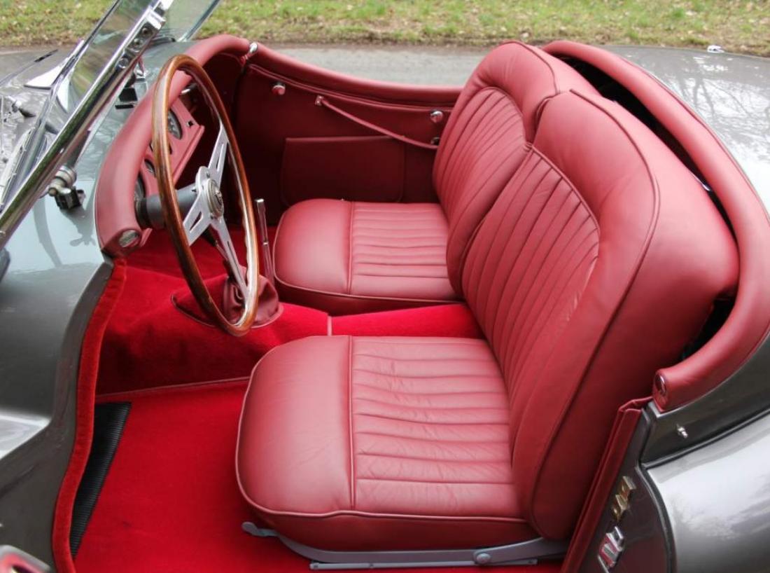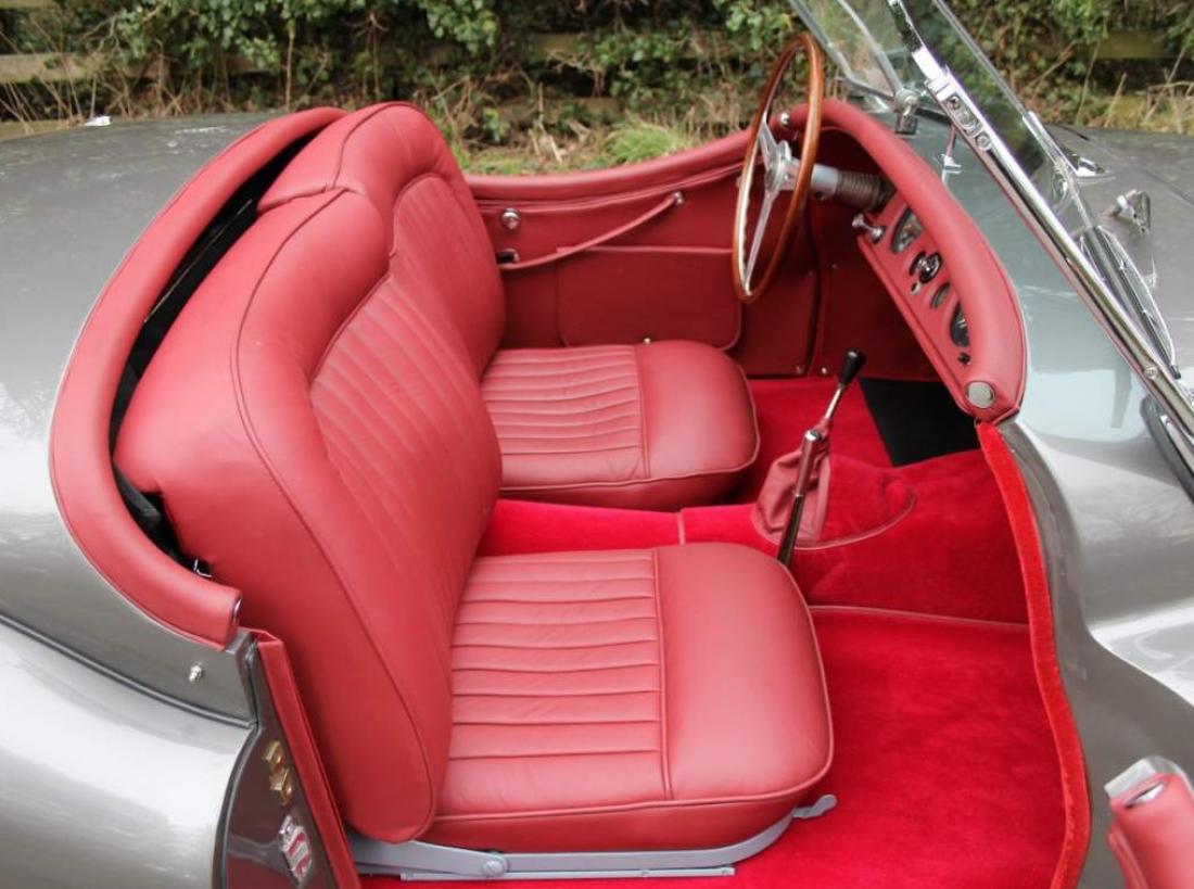 With the running gear removed, the engine was cleaned and detailed, the Moss gearbox fully overhauled. The rear axle was checked, some seals replaced, and a substantial level of mechanical work carried out prior to re-fitting the body. All chrome work was renewed and re-fitted to the car, wire wheels painted in Black and a new set of tyres fitted to the car. The XK was fitted with new floor boards, then the removed upholstery completely re-trimmed in Red leather. The dashboard was re-trimmed with all electrics renewed, hood frame overhauled, poweder coated and all new weather equipment fitted. Various interior chrome work was renewed, new furflexes, rubbers and trims fitted, and the boot compartment totally renewed.