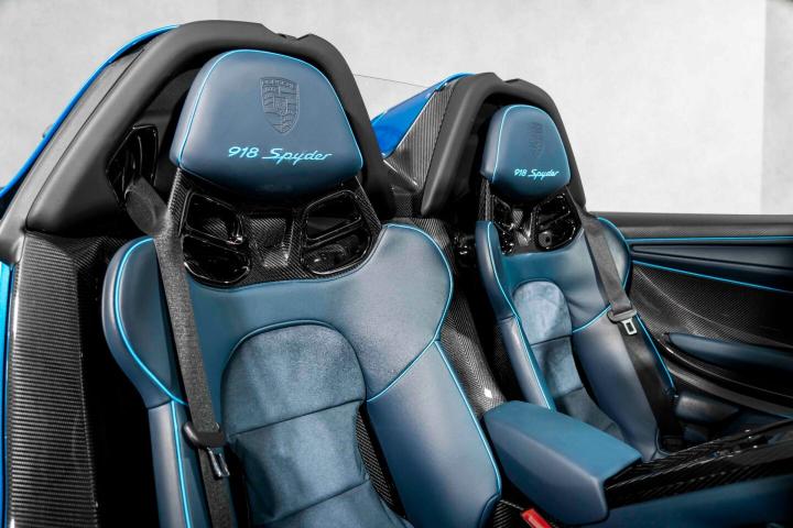 Step inside, and you'll discover an interior that was revolutionary when new and remains timelessly futuristic today. The cabin showcases the interior carbon fibre package, lightweight bucket seats, and a Burmester Surround Sound system. The authentic leather throughout is finished in Yachting Blue, beautifully contrasted by striking Riviera Blue leather pinstripes outlining the seats and door cards, plus matching Riviera Blue stitching on the headrests.