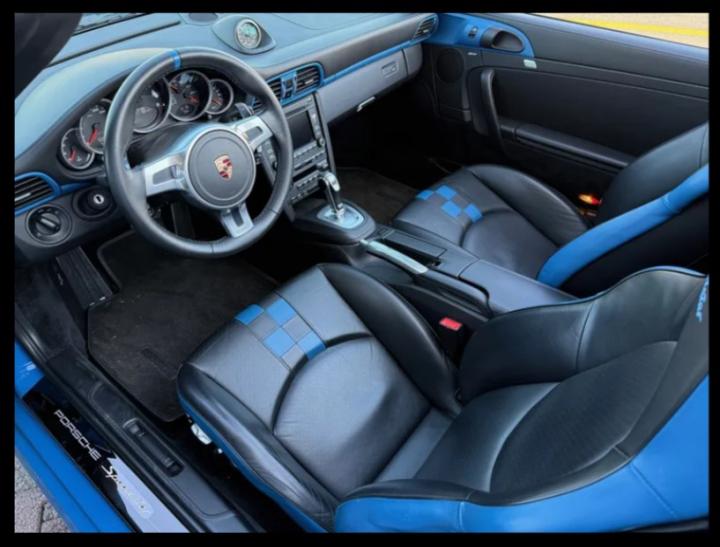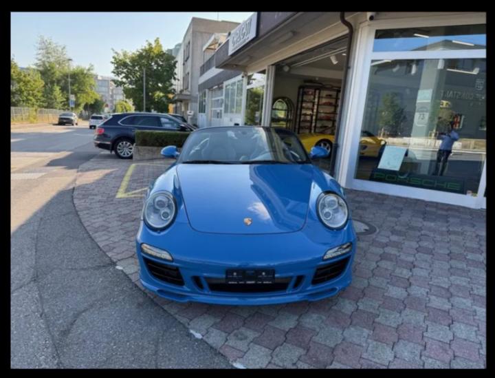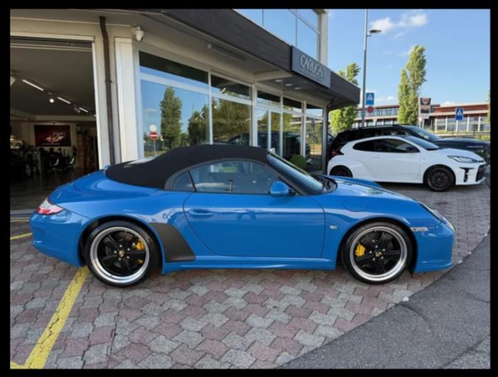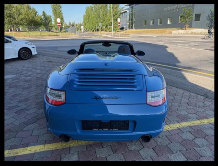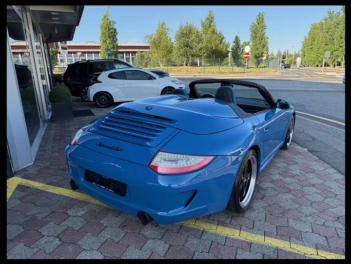 Rare et estivale Porsche 997 Speedster PDK dans une flashy livrée Bleu Profond sur cuir Noir, modèle produit à seulement 356 exemplaires, état magnifique, très soignée, suivi Porsche complet, inspirée de la Porsche 356, elle se distingue par son pare-brise plus court, ses arches de roues élargies, son intérieur luxueux en cuir, équipée du Flat 6 3.8 litres de 408 chevaux, navigation Pack Europe, réception radio SAT, Pack Option 911 Speedster.