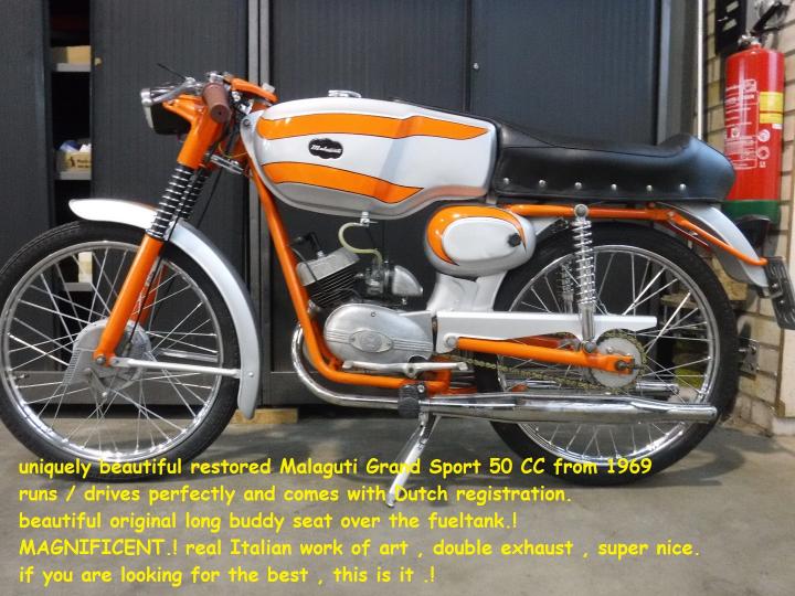 Uniek mooie gerestaureerde Malaguti Grand Sport van 1969. Loopt en rijdt perfect en komt met NL kenteken. Prachtig origineel doorlopend buddyseat. PRACHTIG! Echt Italiaans kunstwerk, dubbele uitlaat, echt super !! Grootste keus in ECHTE klassiekers met meer dan 450 stuks in de Stolze Collectie: van project tot perfect !