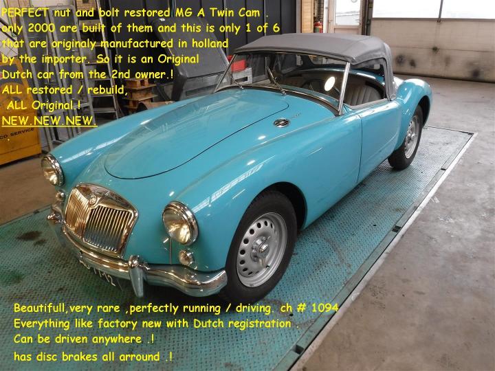Perfecte nut and bolt ; gerestaureerde MG A Twin Cam. Er zijn er maar 2000 van gemaakt en dit is er 1 van de slechts 6 die oorspronkelijk zijn gemaakt in Nederland door de importeur. Het is dus een originele Nederlandse auto ! ALLES origineel en ALLES hersteld gereviseerd of opnieuw opgebouwd. De auto heeft rondom schijfremmen.ZEER mooi, heel zeldzaam, loopt rijdt perfect Alles als fabrieks nieuw met NL kenteken. Is gebruikt op Zandvoort o.a. door Han Vetter (bestuurslid MGA club) Grote keus in ECHTE klassiekers in de Stolze Collectie, van project tot perfect !