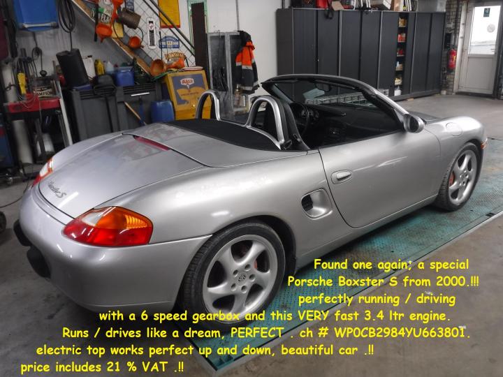 Weer één gevonden; een bijzondere Porsche Boxster S uit 2000. Goed lopend rijdend met een versnellingsbak met 6 versnellingen en een ZEER snelle motor. Loopt rijdt heel goed. De elektrische kap werkt perfect open en dicht, prachtige auto.De prijs is inclusief 21 % BTW. Grote keus in ECHTE klassiekers in de Stolze Collectie: van project tot perfect !