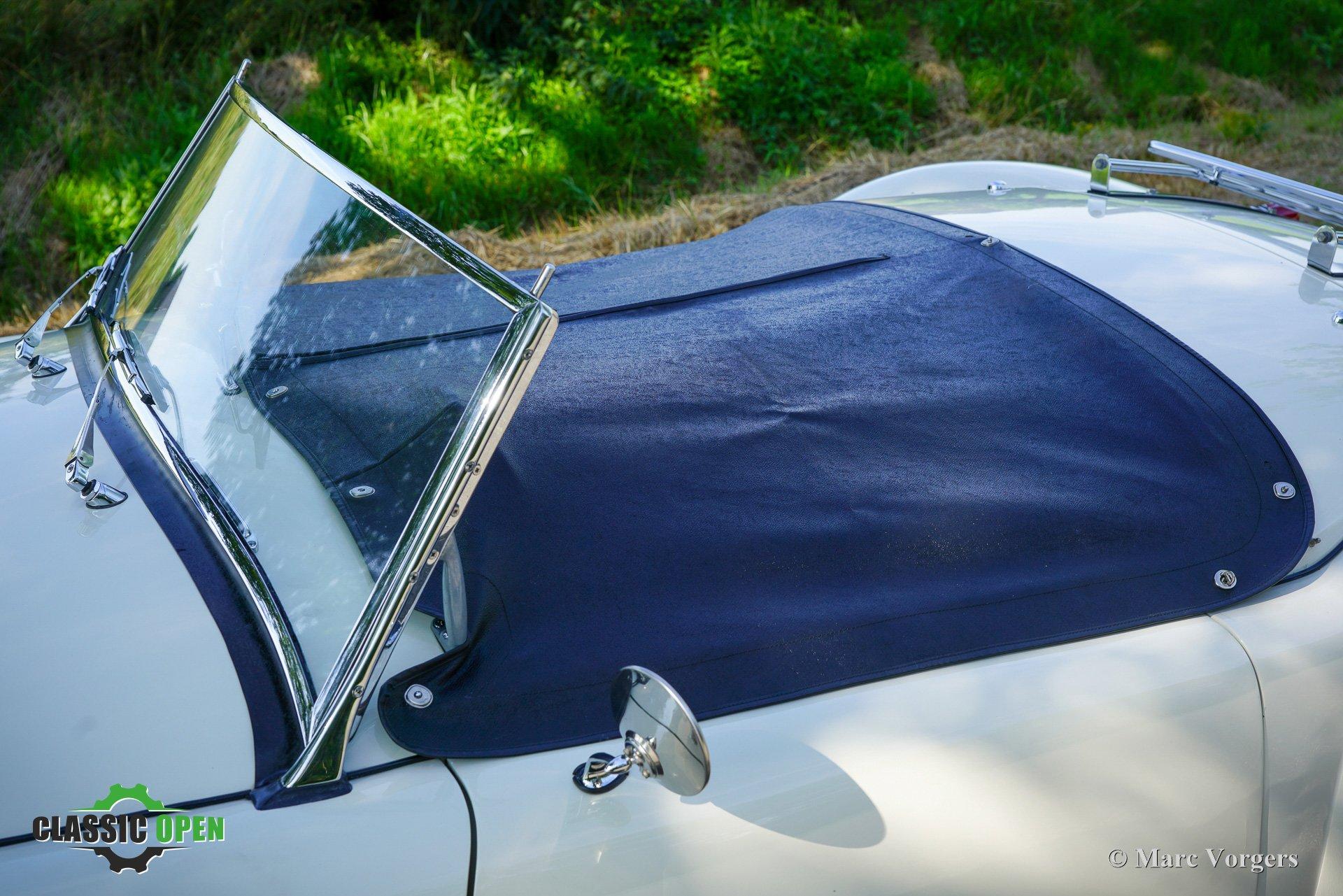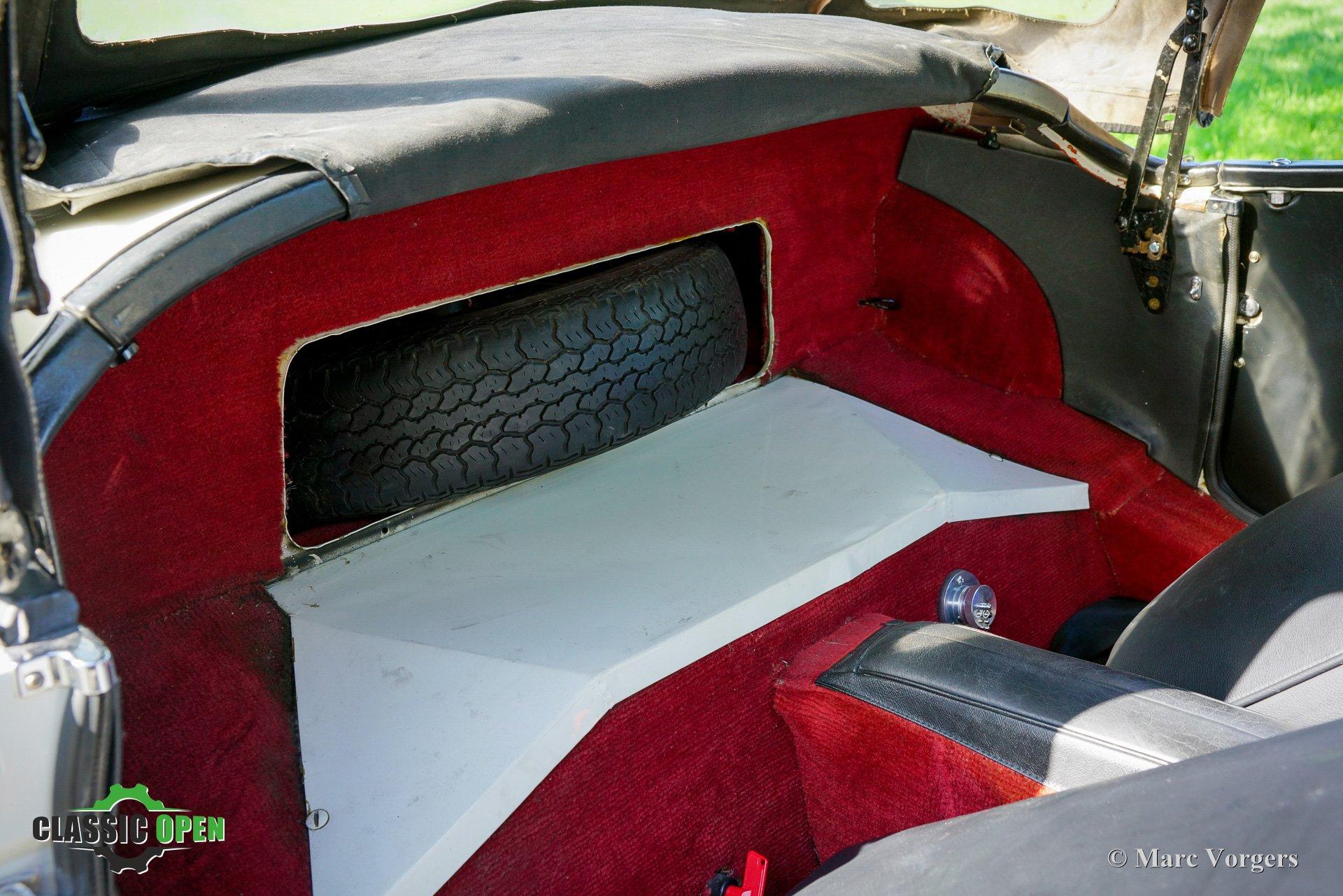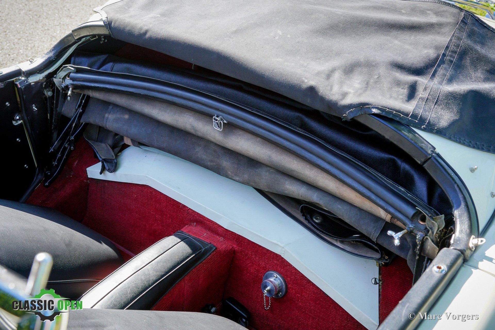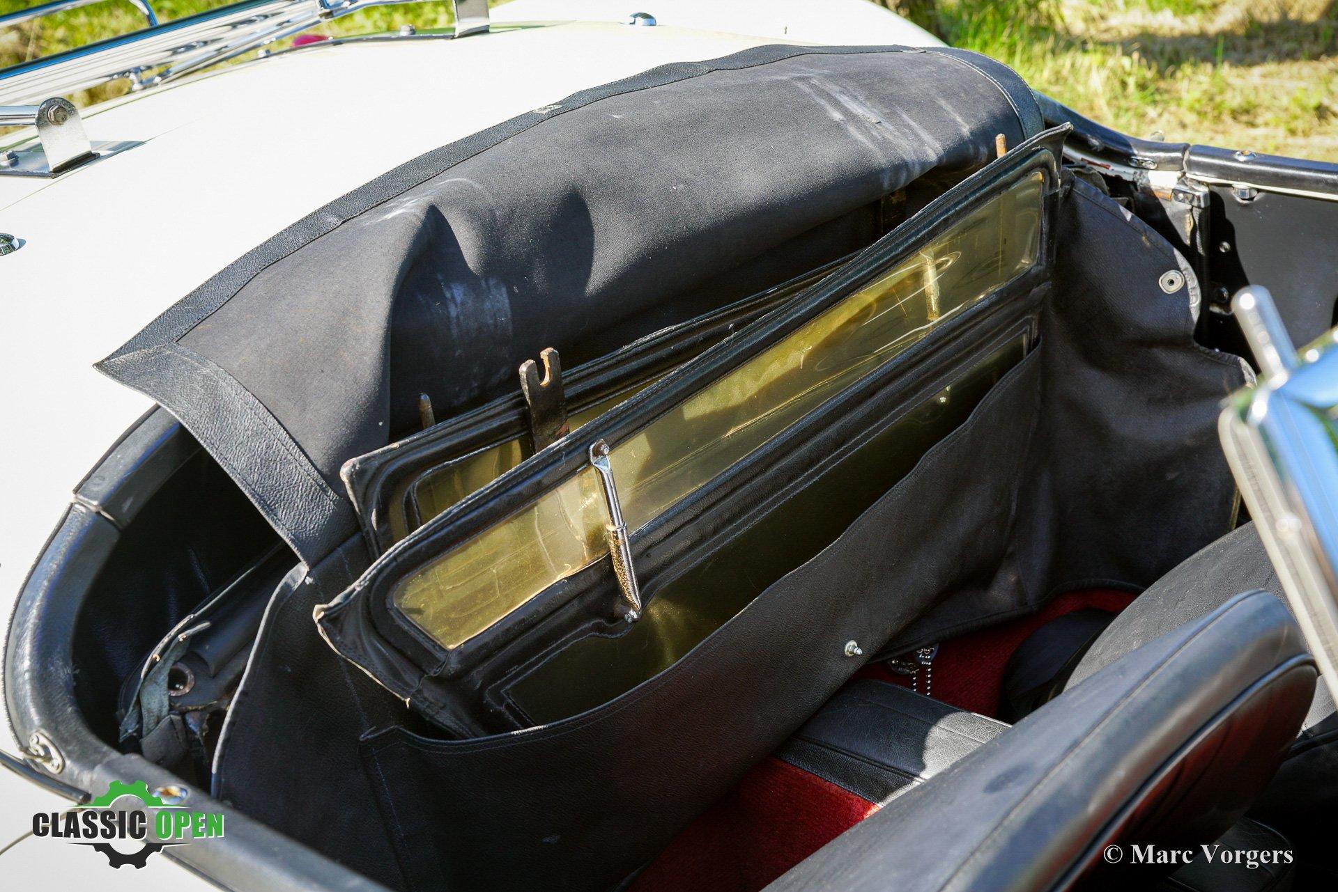 Kleur ’Old English White’ gecombineerd met een zwart interieur (zwartlederen stoelen en kunstleren deurbekleding), en rode vloerbedekking. Zwart vinyl soft-top en zijruitframes.