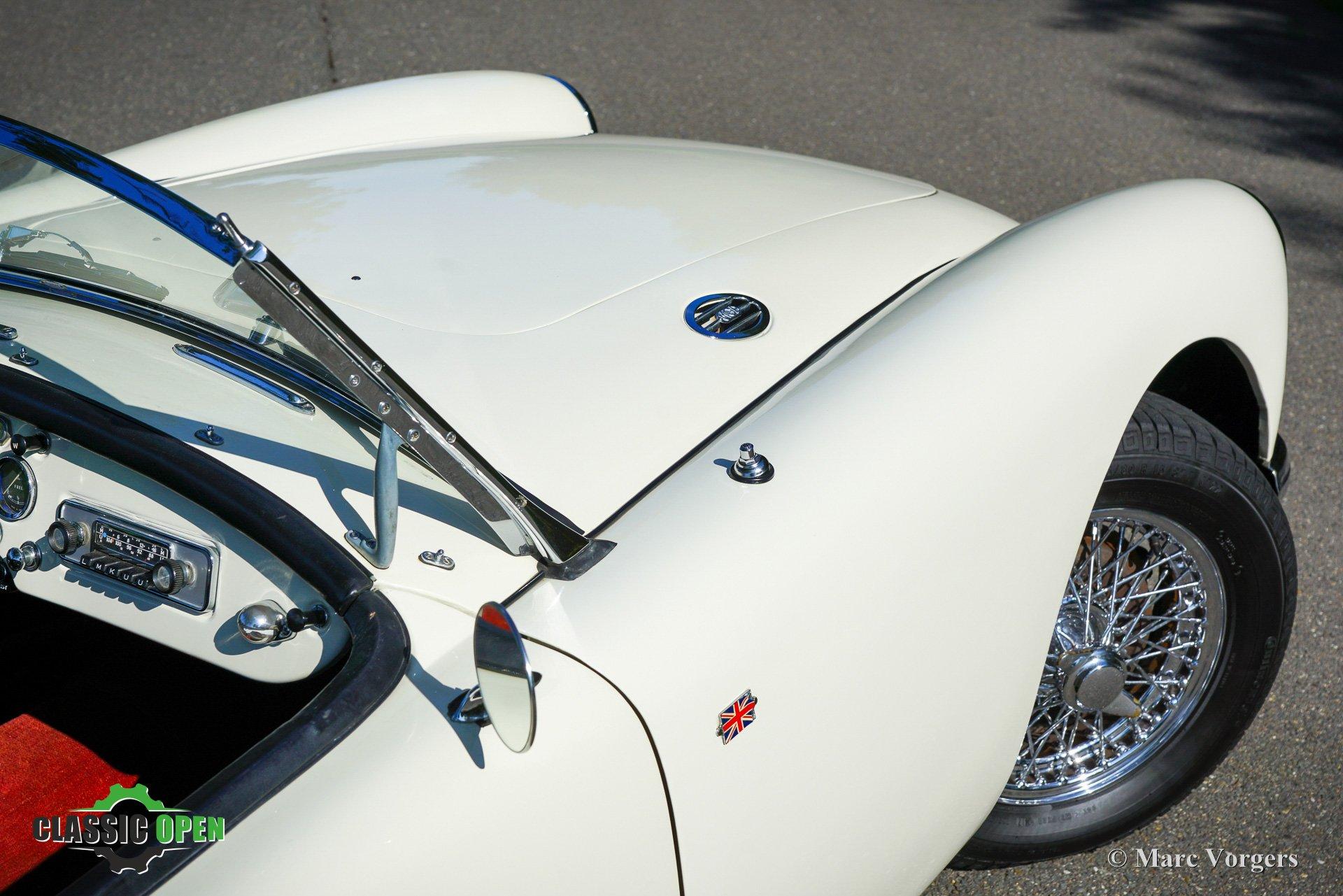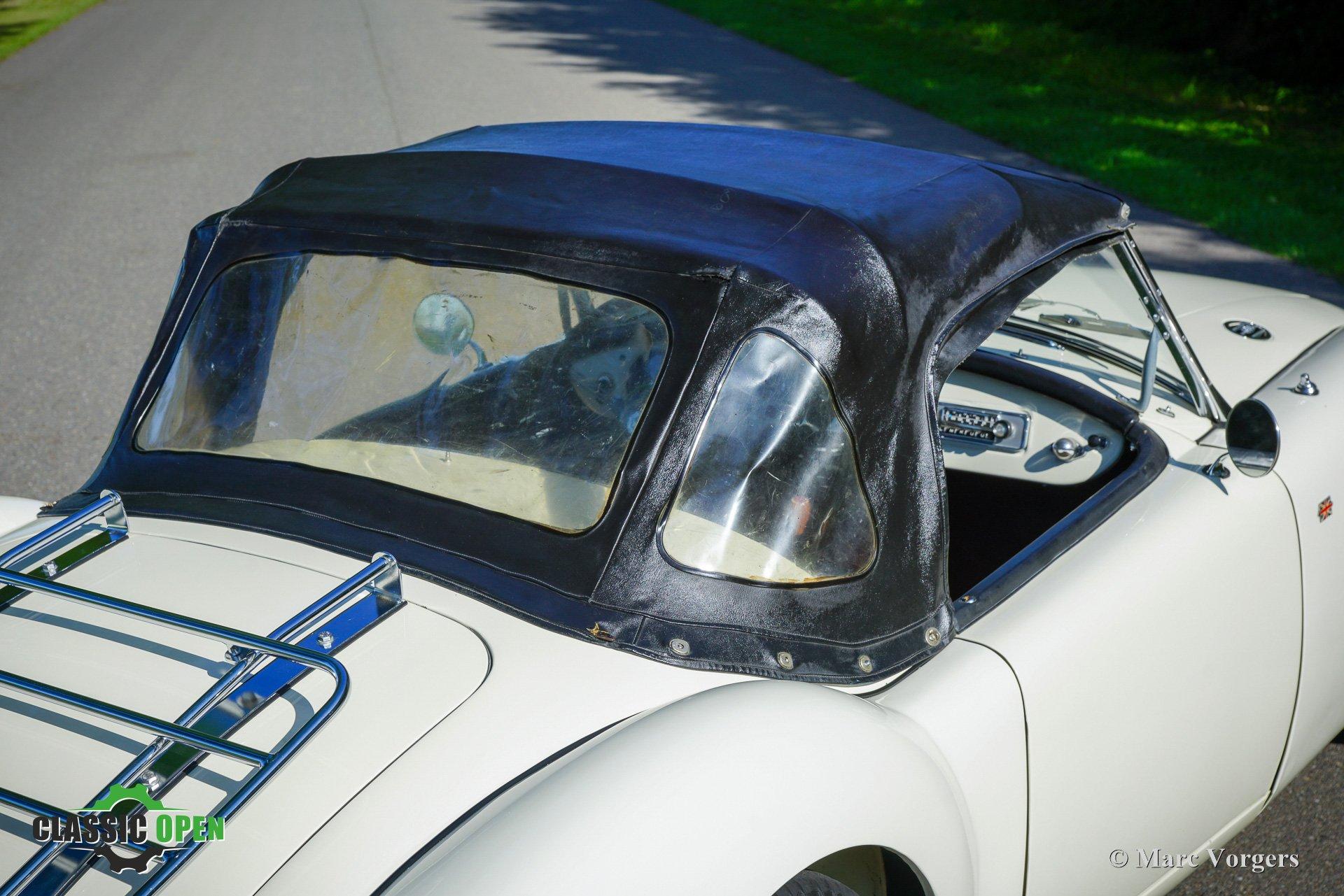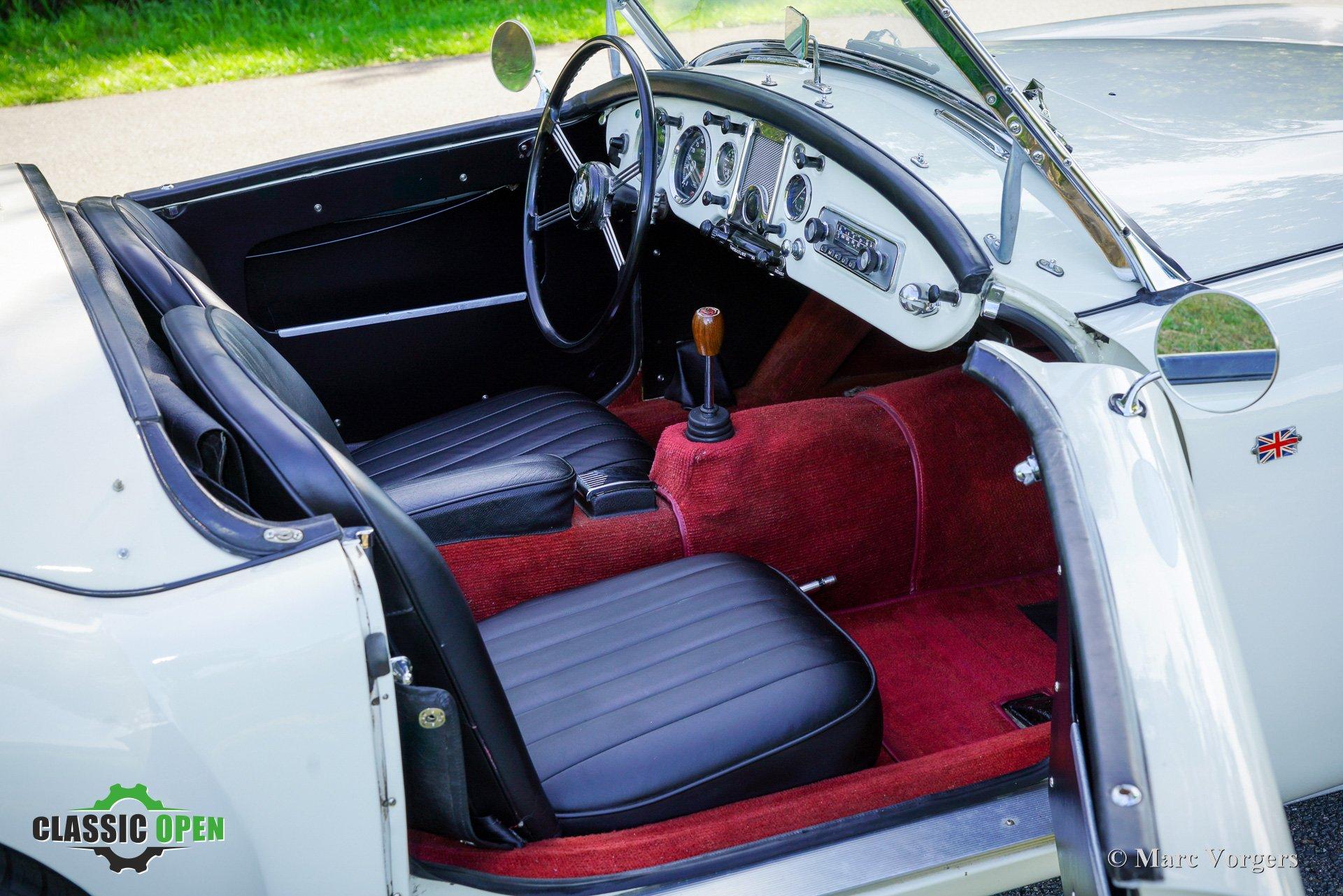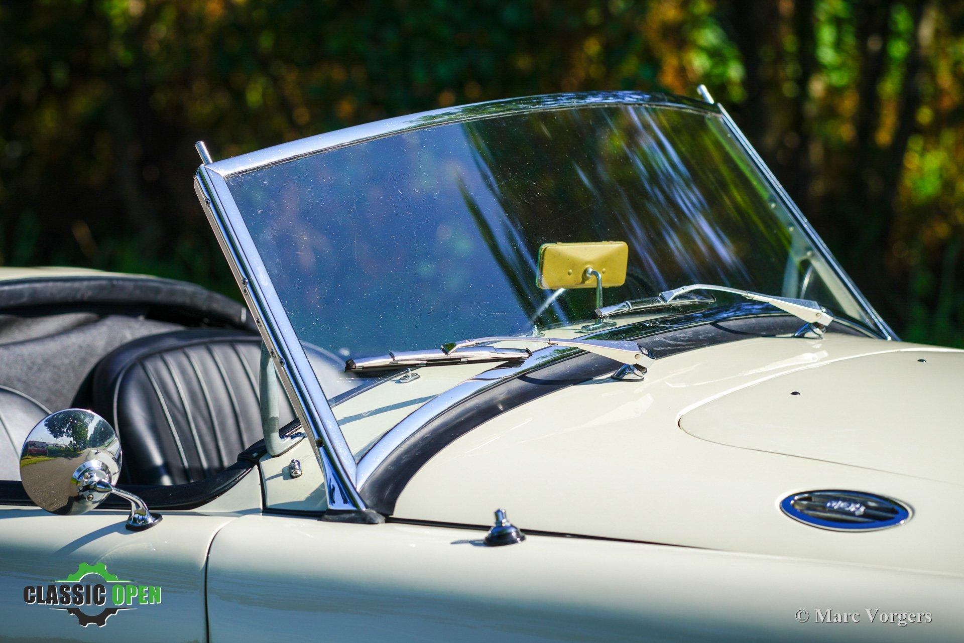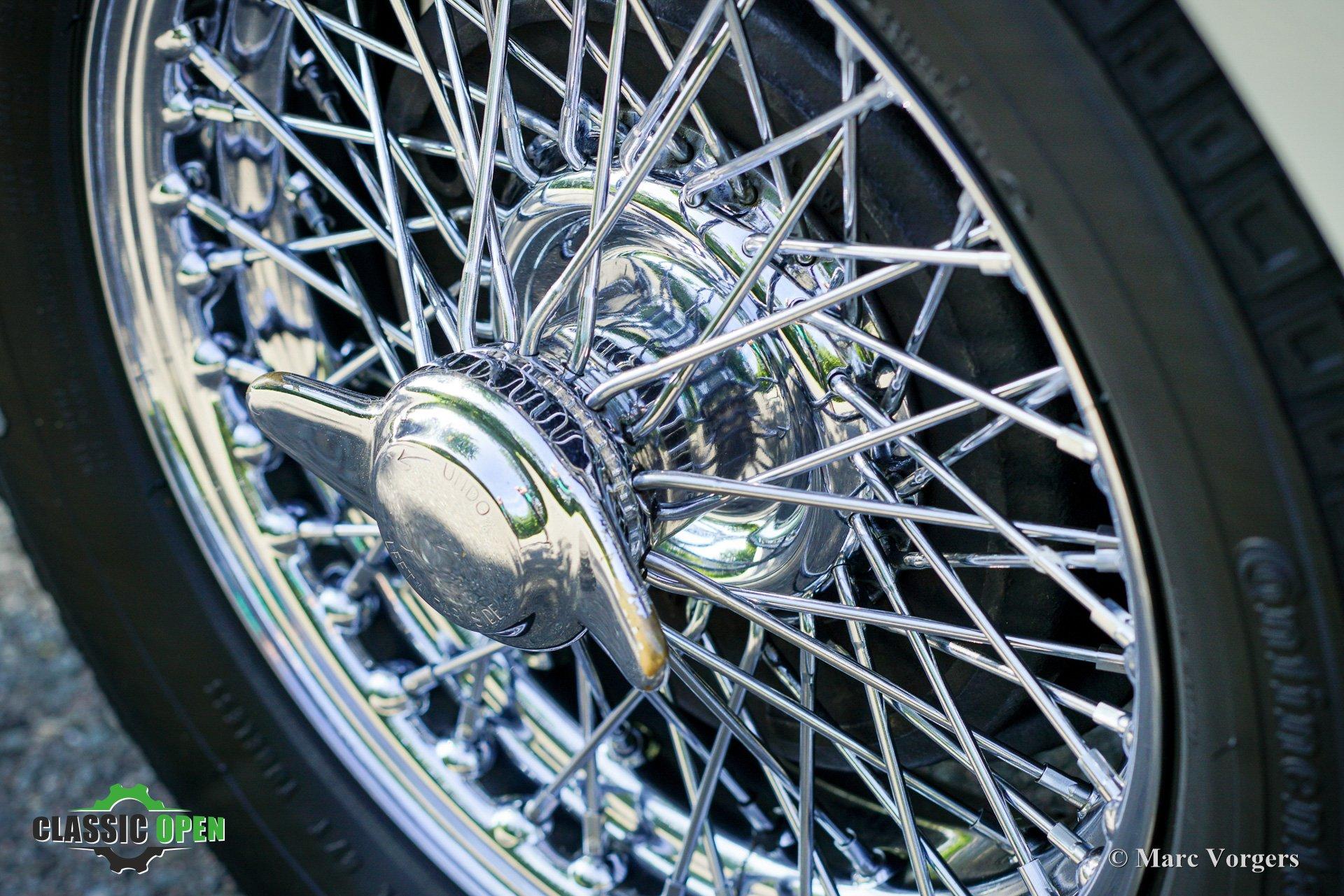 Kleur ’Old English White’ gecombineerd met een zwart interieur (zwartlederen stoelen en kunstleren deurbekleding), en rode vloerbedekking. Zwart vinyl soft-top en zijruitframes.