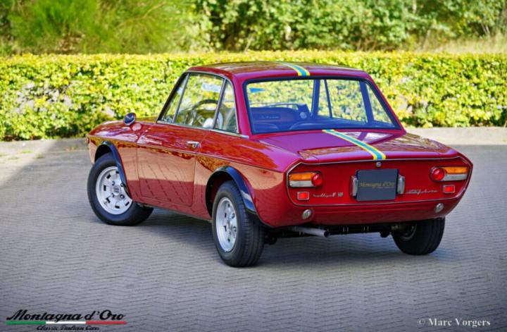 Kleur donkerrood met gele en blauwe strepen waar er 100 van gemaakt zijn dit is dus de “laatste” van die 100 (geel/ blauw van de stad Turijn) gecombineerd met een zwartlederen interieur en zwart tapijt. Deze Lancia Fulvia Coupé 1600 HF is de heilige graal van het Fulvia programma.