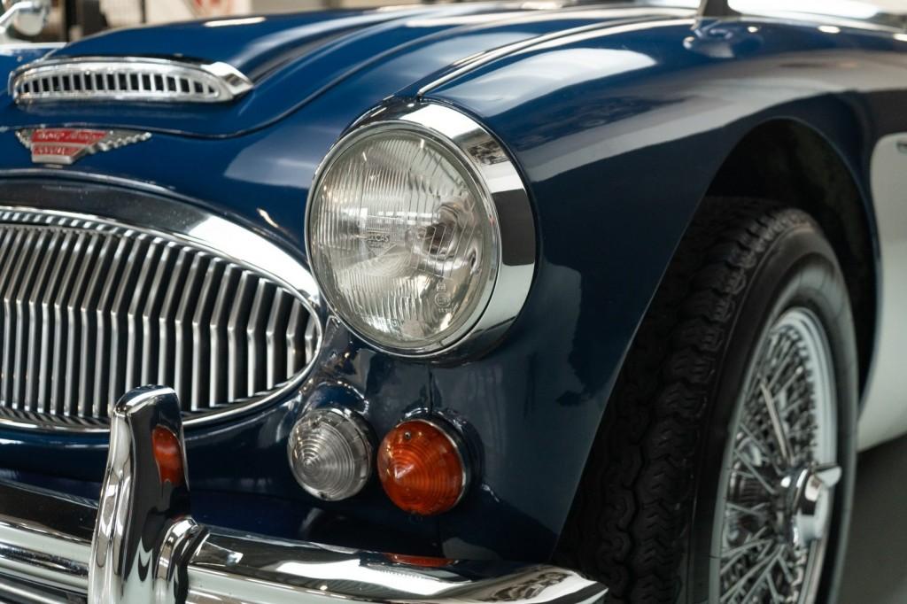 The Austin Healey 3000 MKIII, with its elegant lines and polished aesthetics, personifies the golden age of British sports vehicles. This specimen has a beautiful two-tone paint scheme in blue and white that is in good shape. The chrome trim is all present and well-preserved, which enhances the car's overall attractiveness. With its beautiful proportions, this Healey is a great eye-catcher.