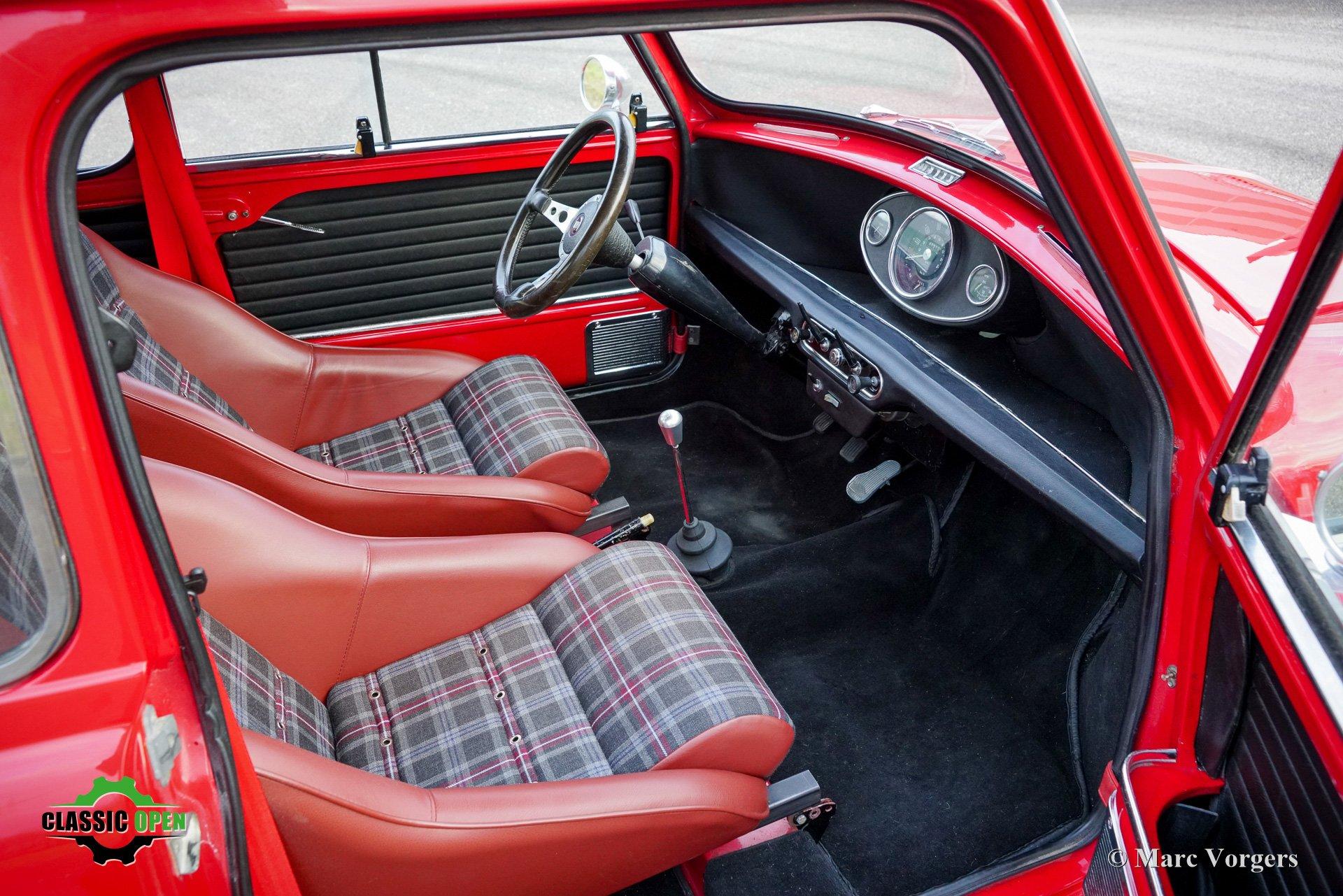 Deze Morris Mini Cooper is in het verleden gerestaureerd en gereviseerd. De auto is voorzien van een krachtige Cooper S 1275 cc-motor met twee S.U.-carburateurs, elektronische ontsteking en andere upgrades om de Cooper S-specificaties te benaderen.