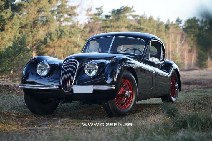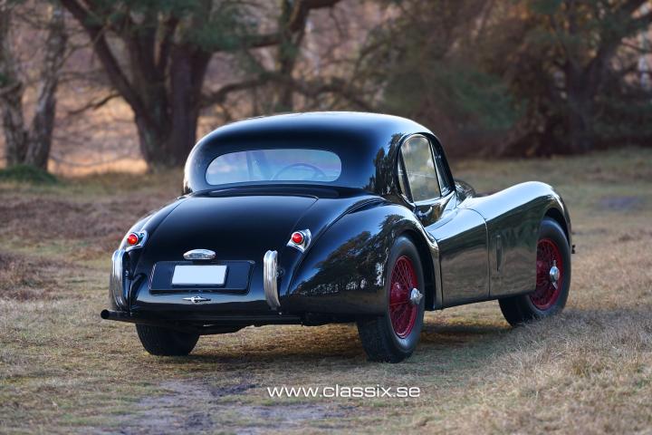 Exterior: The Jaguar XK120 Coupe 1952 looks stunning in black. To make it stand out and look a bit racier, the spoke wheels were painted in red. It is today wearing an older paintwork with small traces of use. The chrome pieces are also in excellent condition and make a great contrast to the black paint. Underneath the car looks as nice as it does on top. The entire frame has been painted and is 100% free from rust and sticky rust protection.