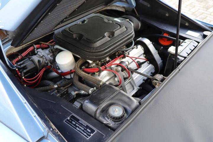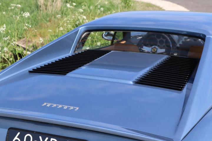 What makes this example rather unique is the original rare colour scheme: 'Azzurro Metallizzato' light blue paintwork with cognac leather upholstery. Particularly tasteful and rare. The car was recently restored with the paintwork professionally repainted. The optical condition is therefore outstanding. During disassembly and reassembly, the car was checked for the original fibreglass panels by reading the factory numbers on the back of these panels. All rims still have the original black 7 1/2 x 14 Campagnolo letters etched on the magnesium. The windows all around are still original and the original ‘California’ side mirror is still present. The underside of the car is also in top condition.