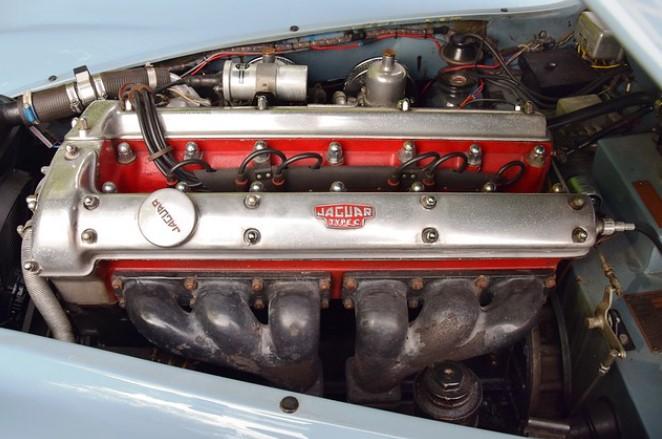 This particular example is completely restored at the end of the nineties, and still looks in great condition. Paint quality is really good, the interior is beautifully trimmed in contrasting dark blue hide, and the mohair hood fits perfectly. The matching nrs engine has the C-Type head from new, and offers great performance. The original Moss 4-speed gearbox is still fitted, and shifts well and unusually easy. For additional driving comfort, the XK140 is fitted with an EZ electrical power steering. The car sits on beautiful wire wheels with stainless steel spokes, and fitted with period correct Michelin Radial X tyres.