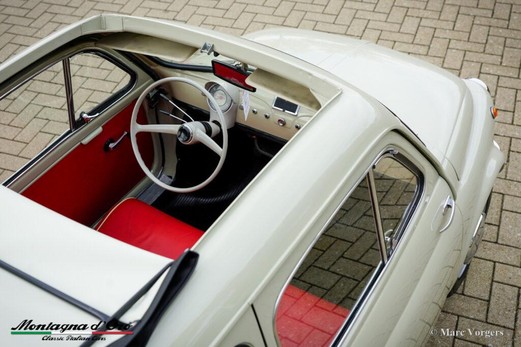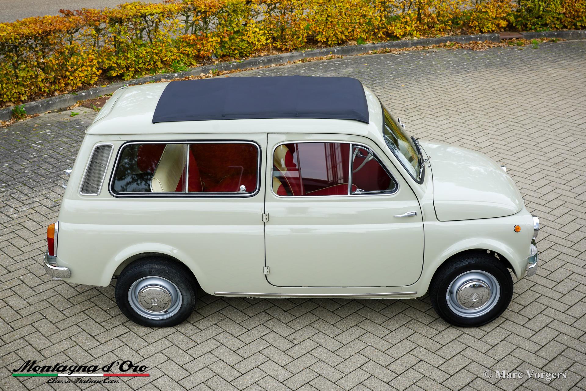 Fiat 120 Nuova 500 Giardiniera, jaar 1965. Chassisnummer Fiat120*144869*, motornummer 120000*243877*. Carrosseriekleur warm grijs (beige) gecombineerd met een rood/crème kunstlederen (vinyl) interieur afgewerkt met zwart rubberen tapijt.
