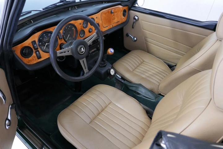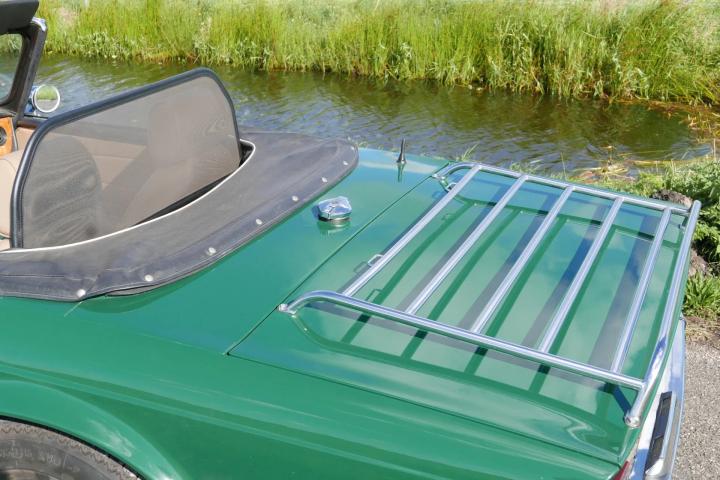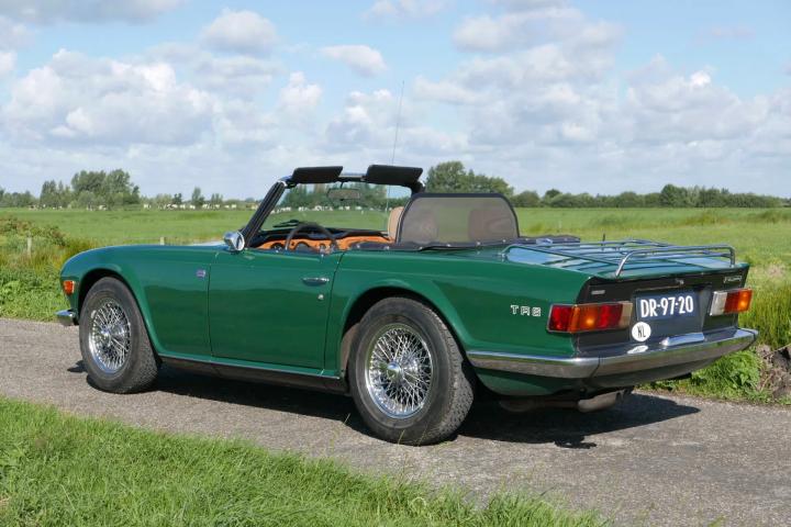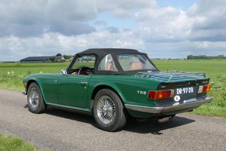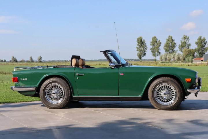 A true sight to behold: the beautiful lines of the TR6 in a classic and highly desirable color scheme. The car is finished in British Racing Green, which pairs elegantly with the beige (imitation leather) upholstery, wood trim in the interior, and shiny wire wheels. Both the paintwork and the chrome, rubber seals, and lights are in excellent and fresh condition. The black mohair soft top is of high quality and also in excellent condition. At the front, Hella spotlights have been fitted. At the rear, a luggage rack is installed. Union Jack emblems proudly adorn the sides.