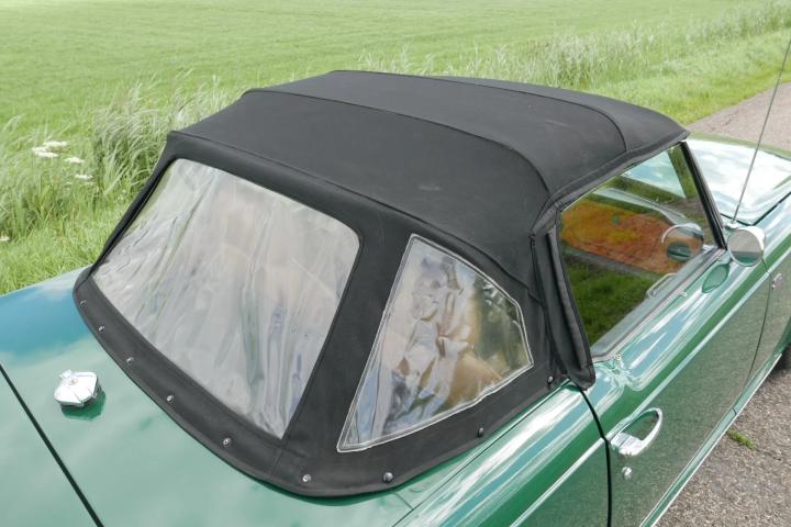 The interior has also been renewed and is therefore in excellent condition. The beige upholstery is finished in beige (imitation leather), and the dashboard is beautifully trimmed with wood. The upgraded seats feature headrests. The floor is covered with elegant green carpeting. The soft top can be stored under a tonneau cover. A wind deflector adds extra comfort while driving. The interior also includes a heater and a Philips radio player. The trunk is neat and, under the double floor, offers space for the spare wheel.