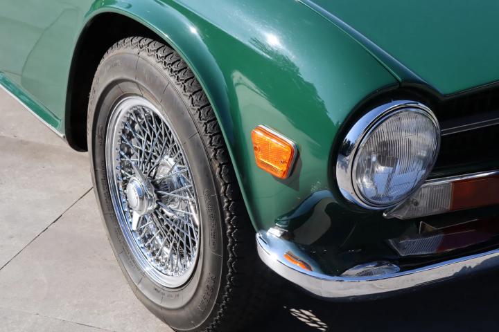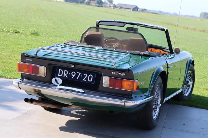 Werkelijk een plaatje om te zien: het prachtige lijnenspel van de TR6 in een klassieke en begeerde (kleur)samenstelling. De auto is namelijk gespoten in British Racing Green, wat mooi combineert met het beige (skai)leder en houtwerk in het interieur en de glimmende spaakwielen. Zowel het lakwerk als het chroomwerk, rubbers en verlichting: alles verkeert in zeer goede en frisse staat. De zwarte 'mohair' linnen softtop is van hoge kwaliteit en verkeert eveneens in uitstekende staat. Aan de voorzijde zijn Hella verstralers gemonteerd. Aan de achterzijde is een bagagerek gemonteerd. Op de zijkant pronken emblemen van de Britse 'Union Jack'.