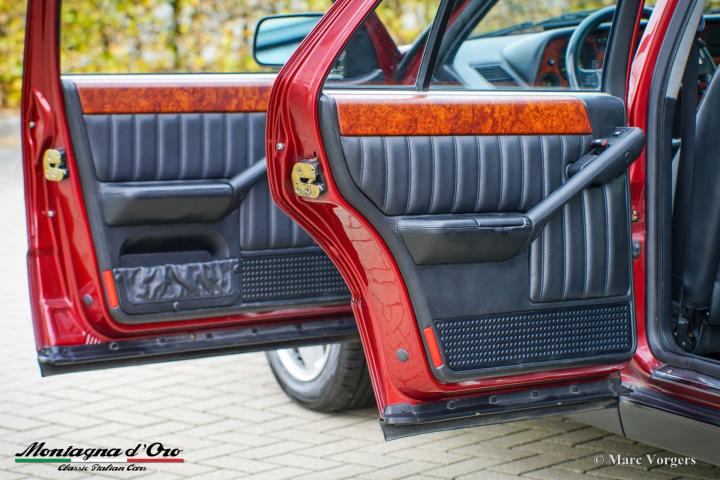 Lancia Thema Ferrari 8.32, jaar 1988. Chassisnummer ZLA834000*00158436*, motornummer F1050046*16585*. Exterieur in rood metallic (Rosso Winner 179/F) gecombineerd met een zwartlederen interieur van Poltrona Frau en grijs tapijt.