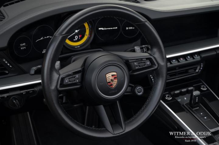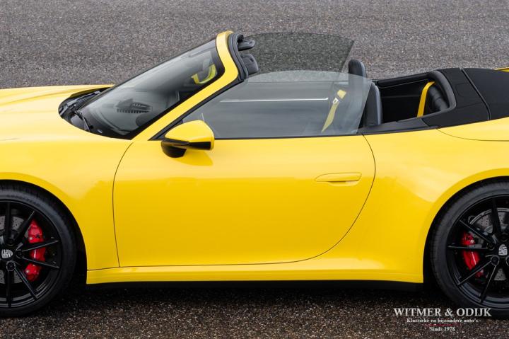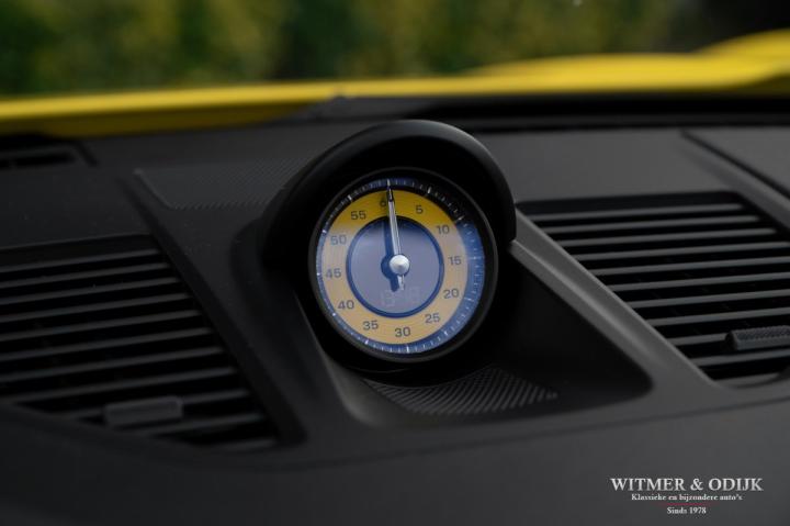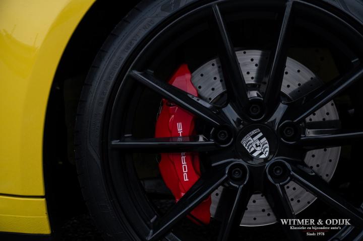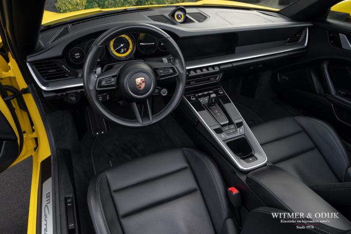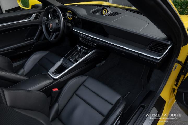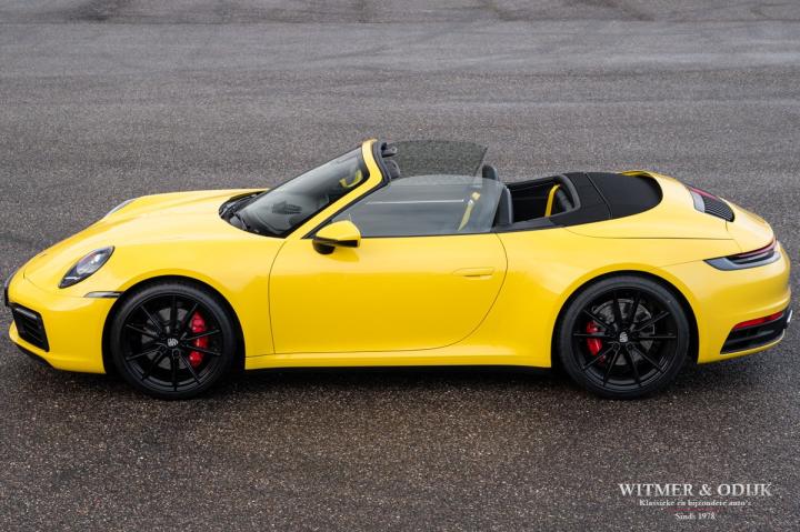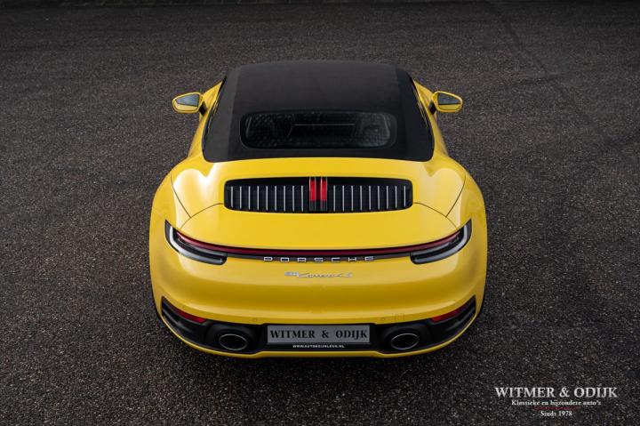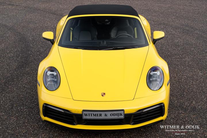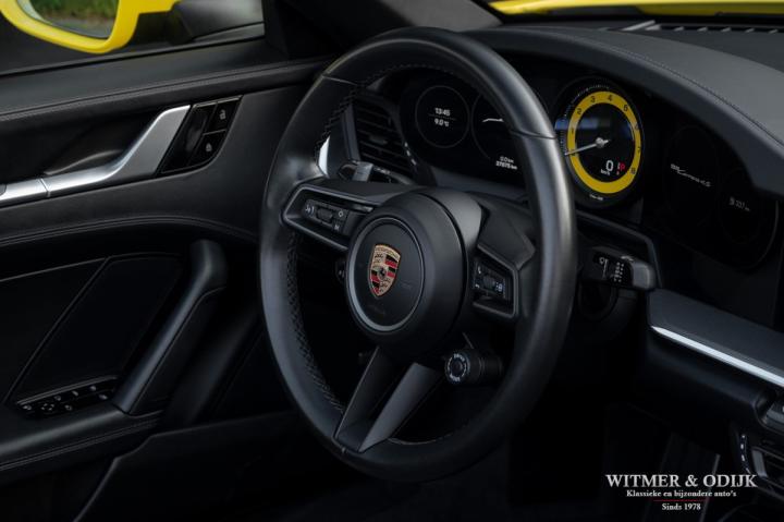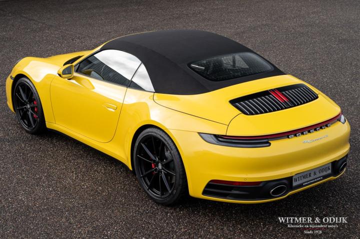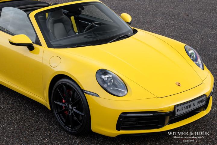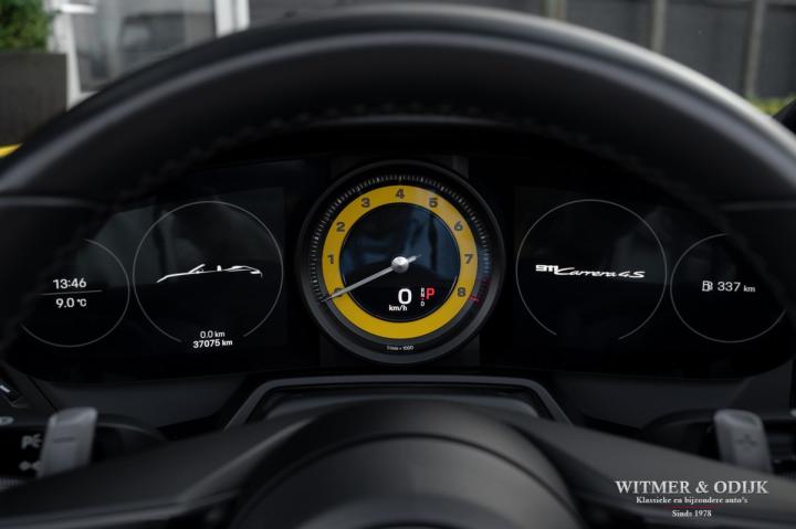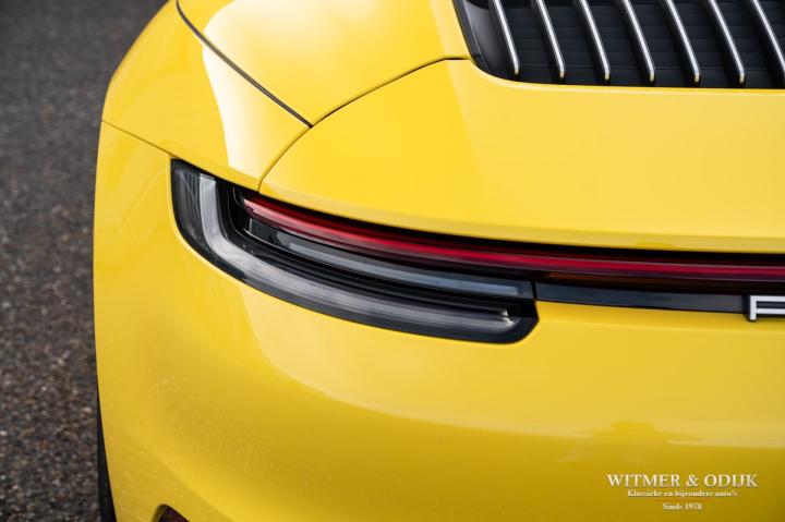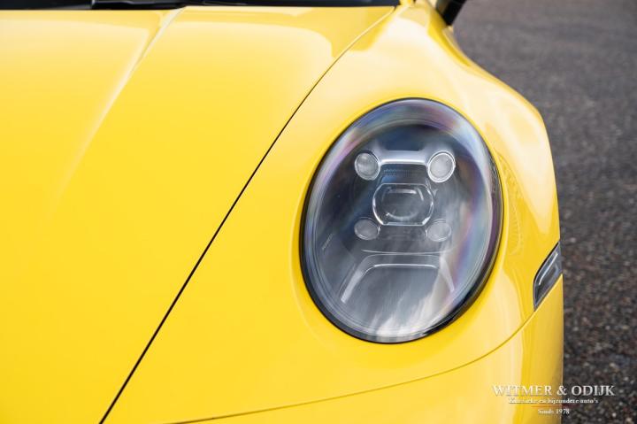 Autofabrikanten gebruiken de meest exotische namen voor de carrosserie kleuren die ze aanbieden. Bij Porsche zijn ze graag wat directer wanneer het om kleur gaat...Racing Yellow! Kan het duidelijker? Niet dat de slechts twee vorige eigenaren het circuit verkende met deze 911. Maar dat we het hier over de beste sport!wagen ter wereld hebben bekrachtigd die kleurnaam nadrukkelijk. Op de foto's komt de auto nog niet half zo sterk voor de dag als dat deze in het echt is, iedere keer als ik door onze showroom loop kan ik mijn ogen niet van deze Porsche afhouden. Met name in deze cabrio versie, met het fraai contrasterende dak en zwarte accenten komt de heerlijk welvende carrosserie zo mooi tot zijn recht. Optisch overigens in nieuwstaat, ook het interieur is als gevolg van de aantrekkelijk lage kilometerstand in topconditie. Voorzien van alle belangrijke opties; zo zijn er o.a. automatische dual zone climat control, regelbare stoelverwarming, elektrisch verstelbare sportstoelen met geheugen, Sport Chrono pakket (met fraai in geel uitgevoerde wijzerplaat), schakelbare sportuitlaat, Porsche Communication Management met navigatie en Carplay, achteruitrijcamera, rondom Parc Distance Control, cruise control, LED verlichting, elektrisch opklapbaar windscherm, Bose soundsystem met subwoofer, multifunctioneel en verstelbaar GT sportstuur, een volledig in leer uitgevoerd interieur, prachtige lichtmetalen velgen 20 en 21 inch, etc. De carrosserie, het cabriodak, de velgen en bumpers, alles is optisch in bijzonder fraaie nieuwstaat. Rijklaar in onze showroom, maak a.u.b. even aan afspraak als u deze 992 Carrera 4S wilt bezichtigen.