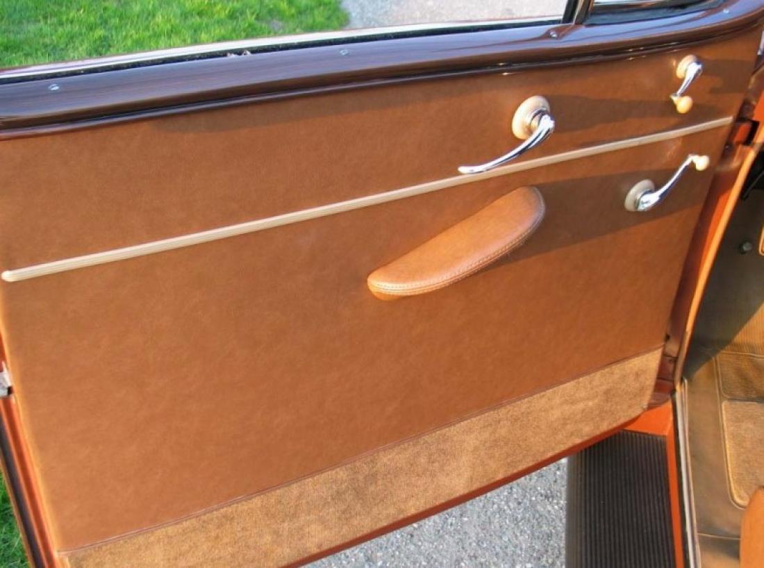 Chestnut brown with brown leatherette interior with cloth inserts.