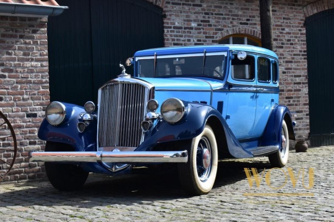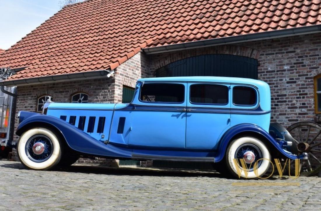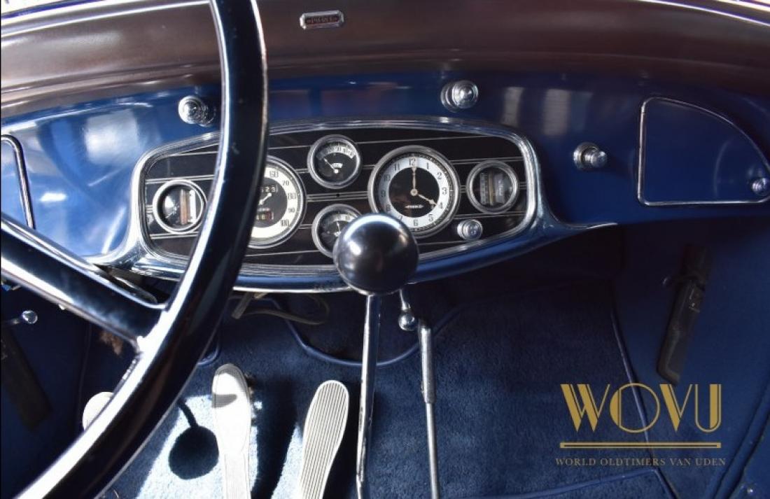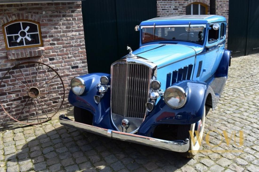Deze statige wagen heeft geïntegreerde koplampen, iets wat begin jaren 30 nog amper gezien werd.