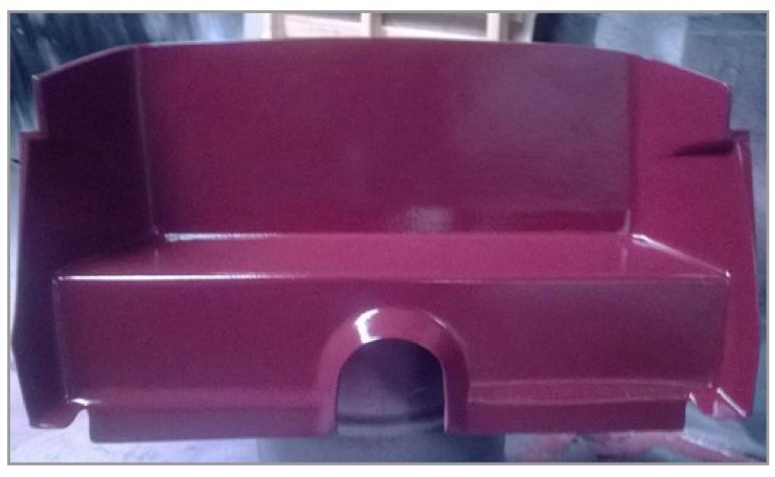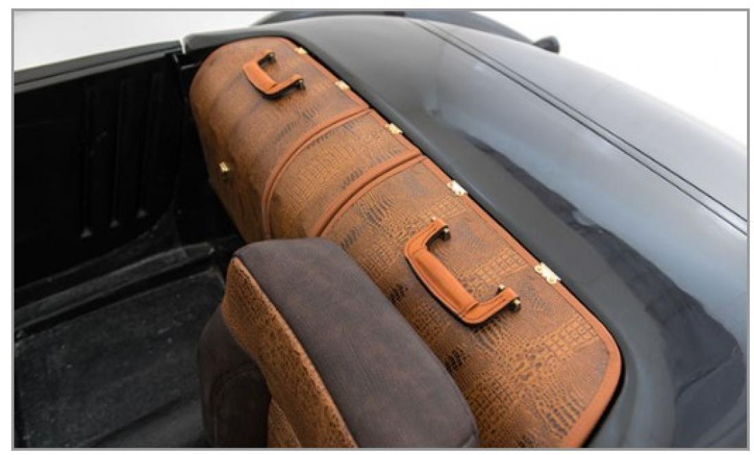 Just forward of the storage boot for the top there is a sculptured rear passenger compartment bulkhead (see magenta photo). It runs across the rear of the interior to provide structural rigidity and support to the B-posts and suicide door hinges. This shelf is designed to accept three curved, custom-fitted suitcases designed to artistically fill the space (included). They tuck upright behind the seats. Our three custom suitcases shown are covered in faux alligator fabric, but you can redo them in any fabric you choose to match your interior. The center suitcase is narrower and holds your choice of a Magnum of champagne or a large bottle of Congac. A vertical leather strap (not included or shown) running through the handle would secure each suitcase.