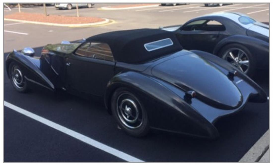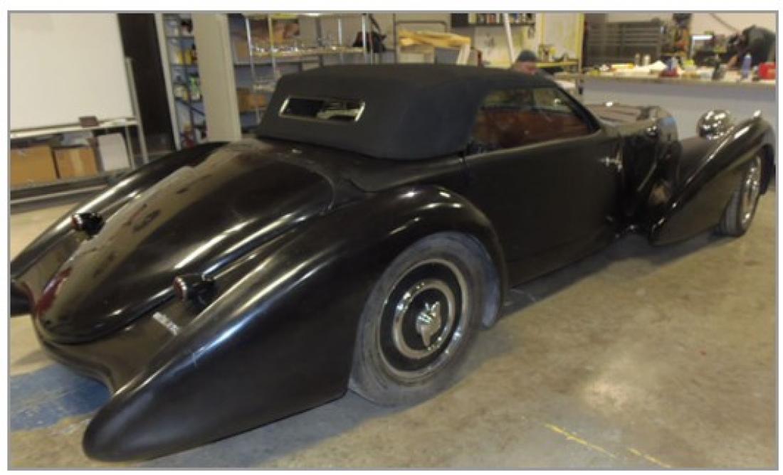 Our "Tribute" car has a convertible top with fixed windshield posts and working power windows installed so the car can have air conditioning. DELAHAYE USA fiberglass body kit ($12,900) mounted on our rolling chassis ($14,300). Beautiful folding top hides away completely in special boot between trunk and passenger’s compartment. Hinged trunk, hinged convertible top boot cover, hinged and latched doors. With a 127-inch wheelbase, ten inches longer than the original Bugatti, there is considerably more interior space. Headroom and legroom for a 6 ft. 10 in. basketball player. Shoulder to shoulder room for two NFL tackles.