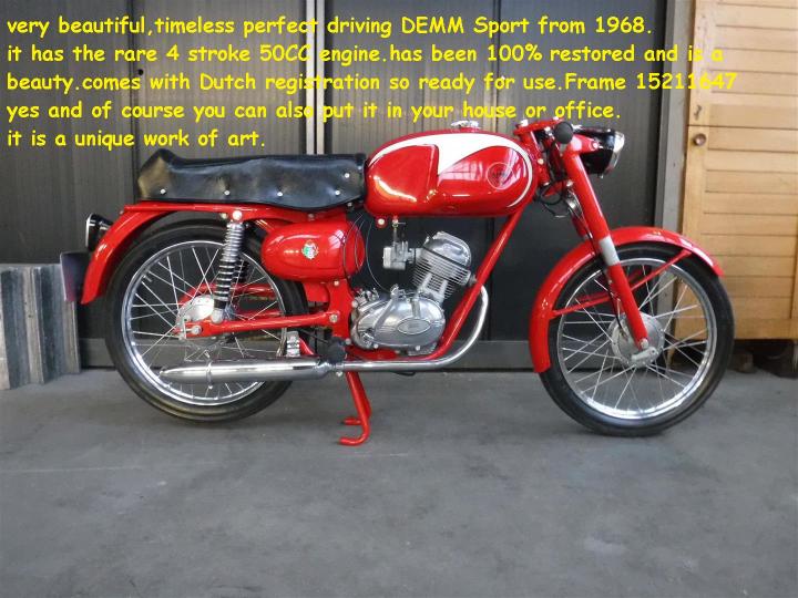 Zeer mooie , perfect rijdende DEMM Sport van 1968: een zeldzaam 4-takt 50CC motortje. Prachtig mooi en is 100 % gerestaureerd. Komt met NL kenteken dus klaar voor gebruik. Ja en u kunt hem natuurlijk ook in de kamer of kantoor zetten, dit unieke kunstwerk ! Grootste keus in ECHTE klassiekers met meer dan 450 stuks in "de Stolze Collectie", van project tot perfect !